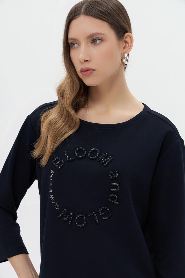 Пуловер имеет тёмно-синий цвет и украшен круглым принтом с надписью "Bloom and Glow", выполненным в тон изделия. Вырез горловины – округлый, рукава – три четверти. Слегка спущенная линия плеч придает модели расслабленный и современный вид.