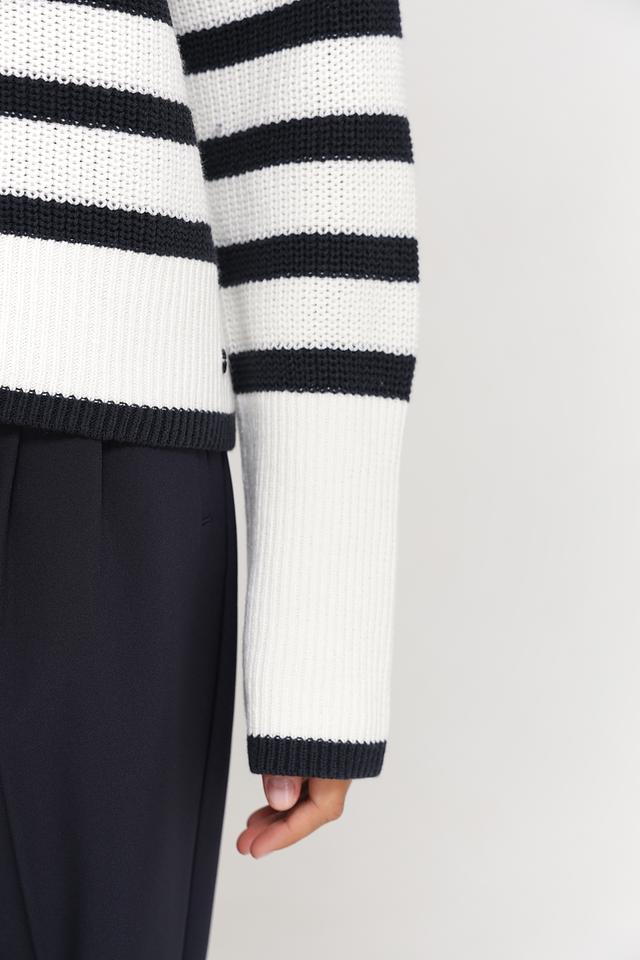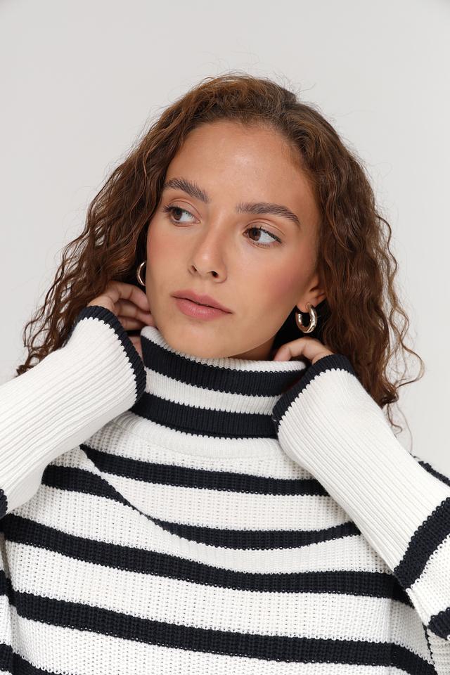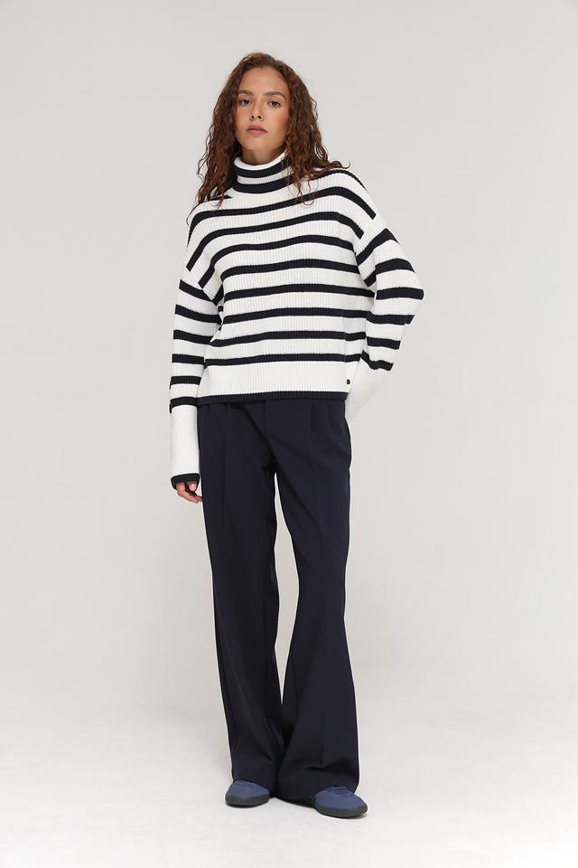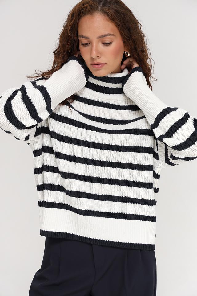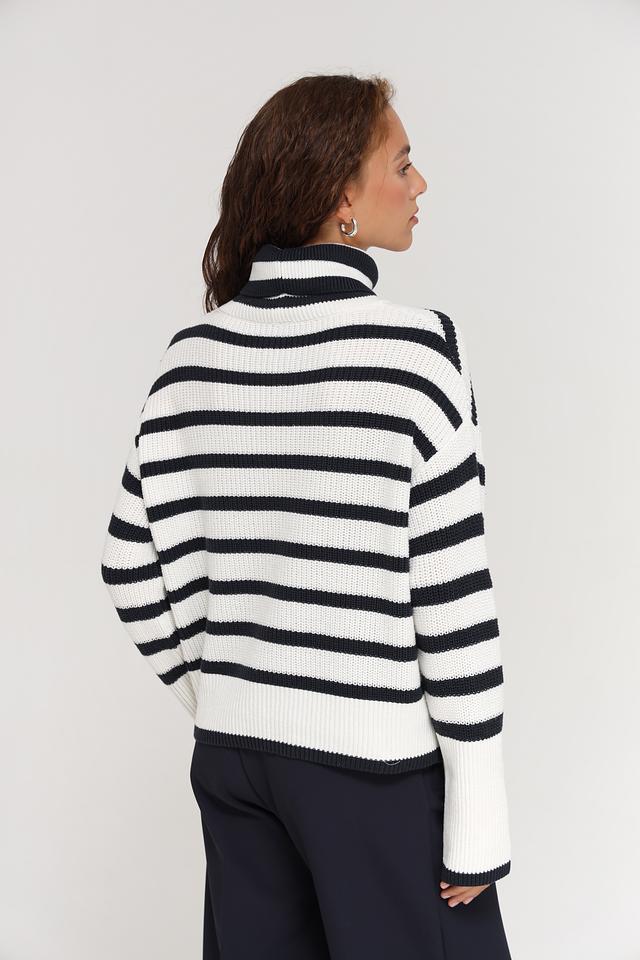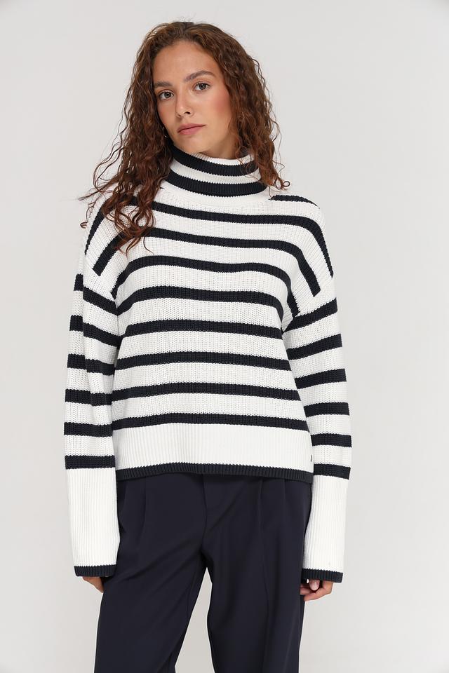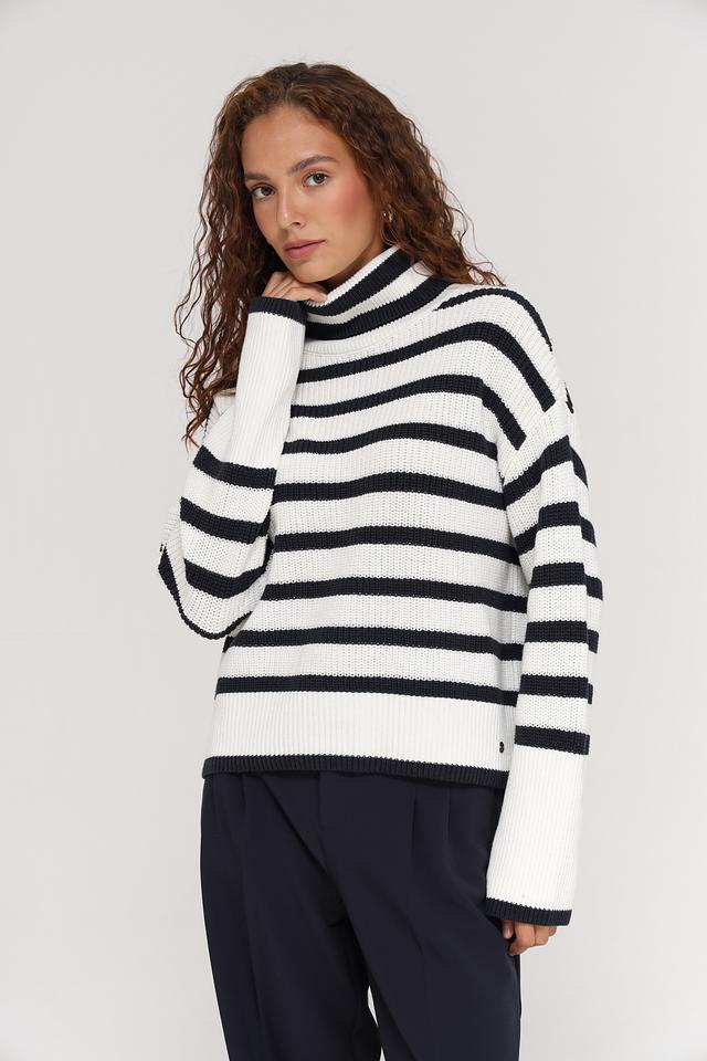 Женский пуловер Monari сине-белого цвета с полоской и высоким горлом. Модель выполнена из мягкого трикотажа, сочетающего хлопок и полиакрил, что обеспечивает комфорт и удобство в носке. Состав: хлопок 60%, полиакрил 40%