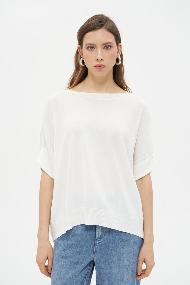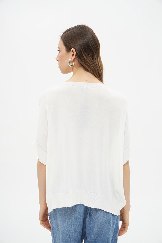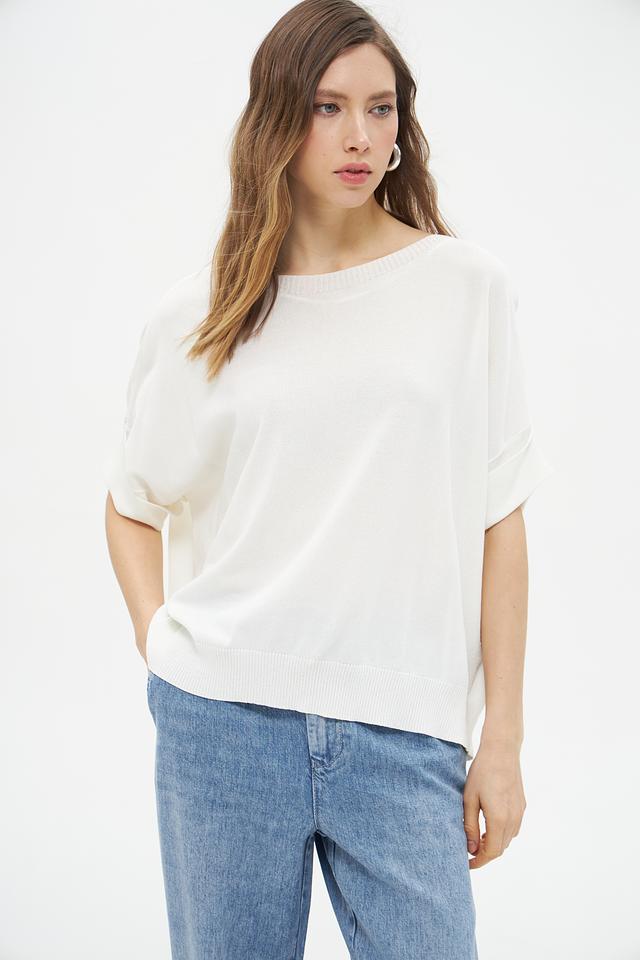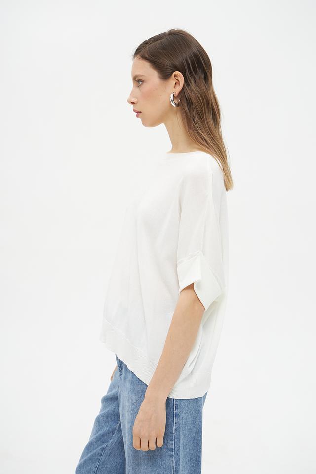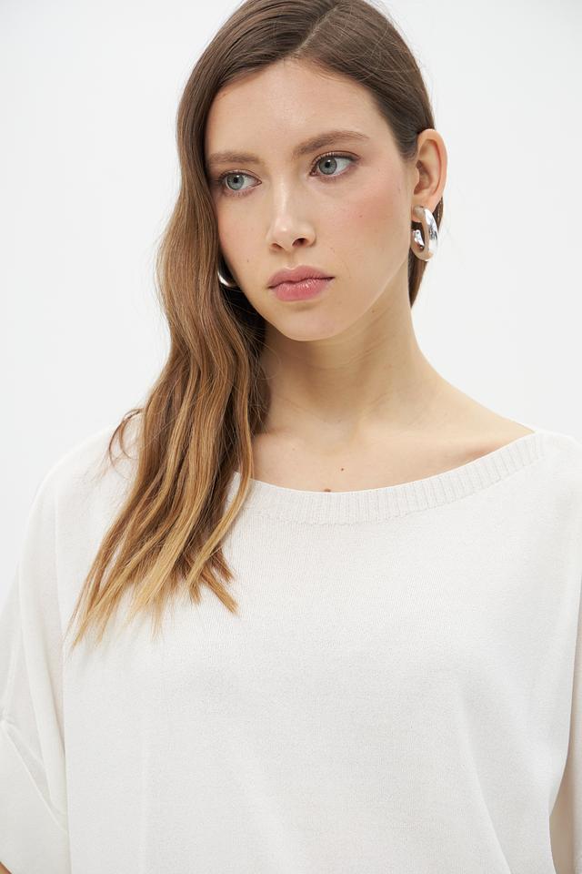 Модель имеет свободный крой, который обеспечивает комфорт в носке. Рукав 3/4 добавляет образу лёгкости и непринуждённости. Округлый вырез горловины делает пуловер универсальным и подходящим для разных случаев.