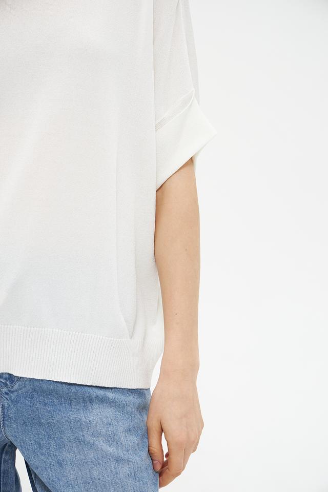 Белый пуловер от MORE and MORE из мягкой вискозы и полиамида. Модель свободного кроя с рукавом 3/4 и округлым вырезом горловины. Идеально сочетается с джинсами и брюками. Состав: вискоза 65%, полиамид 35%