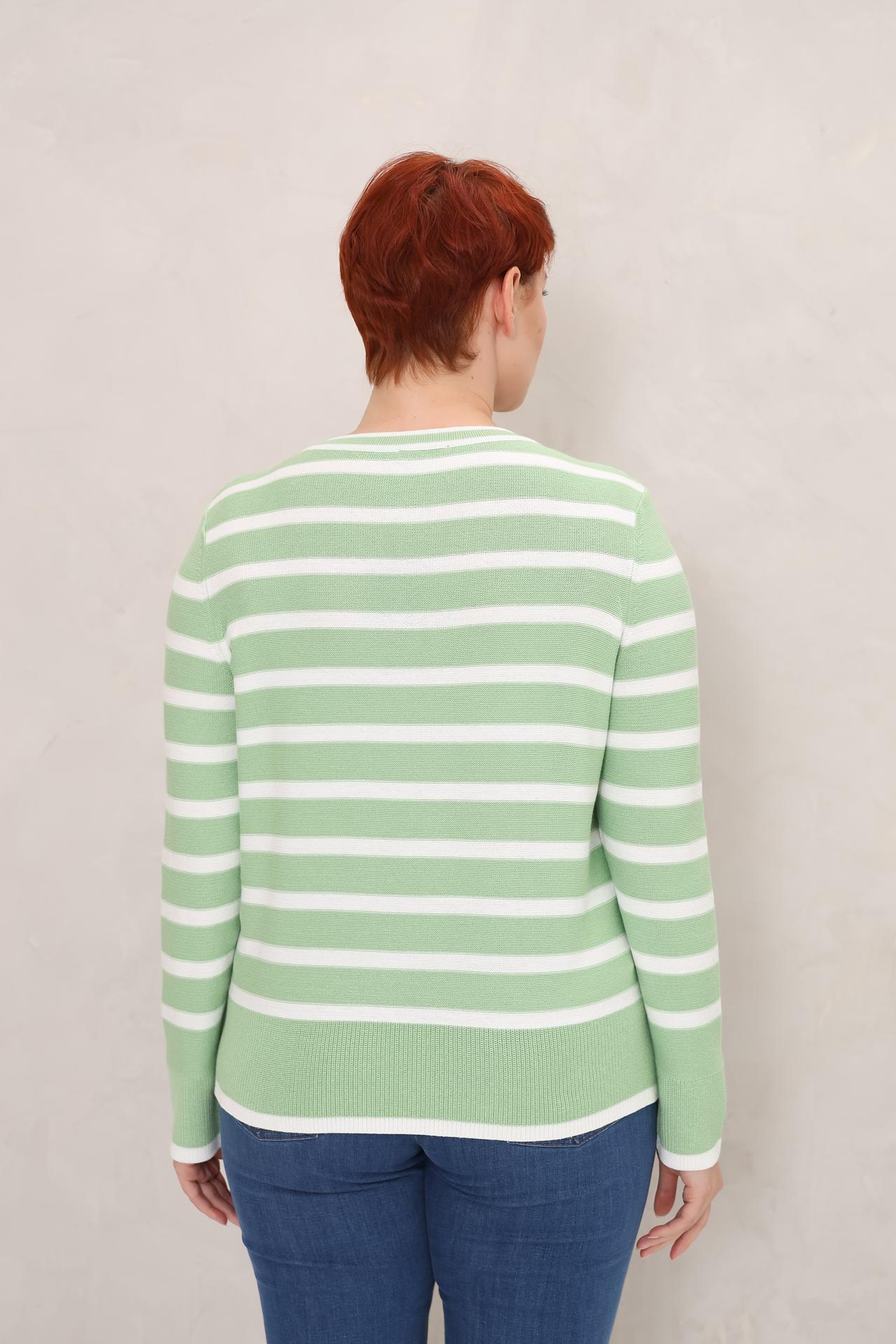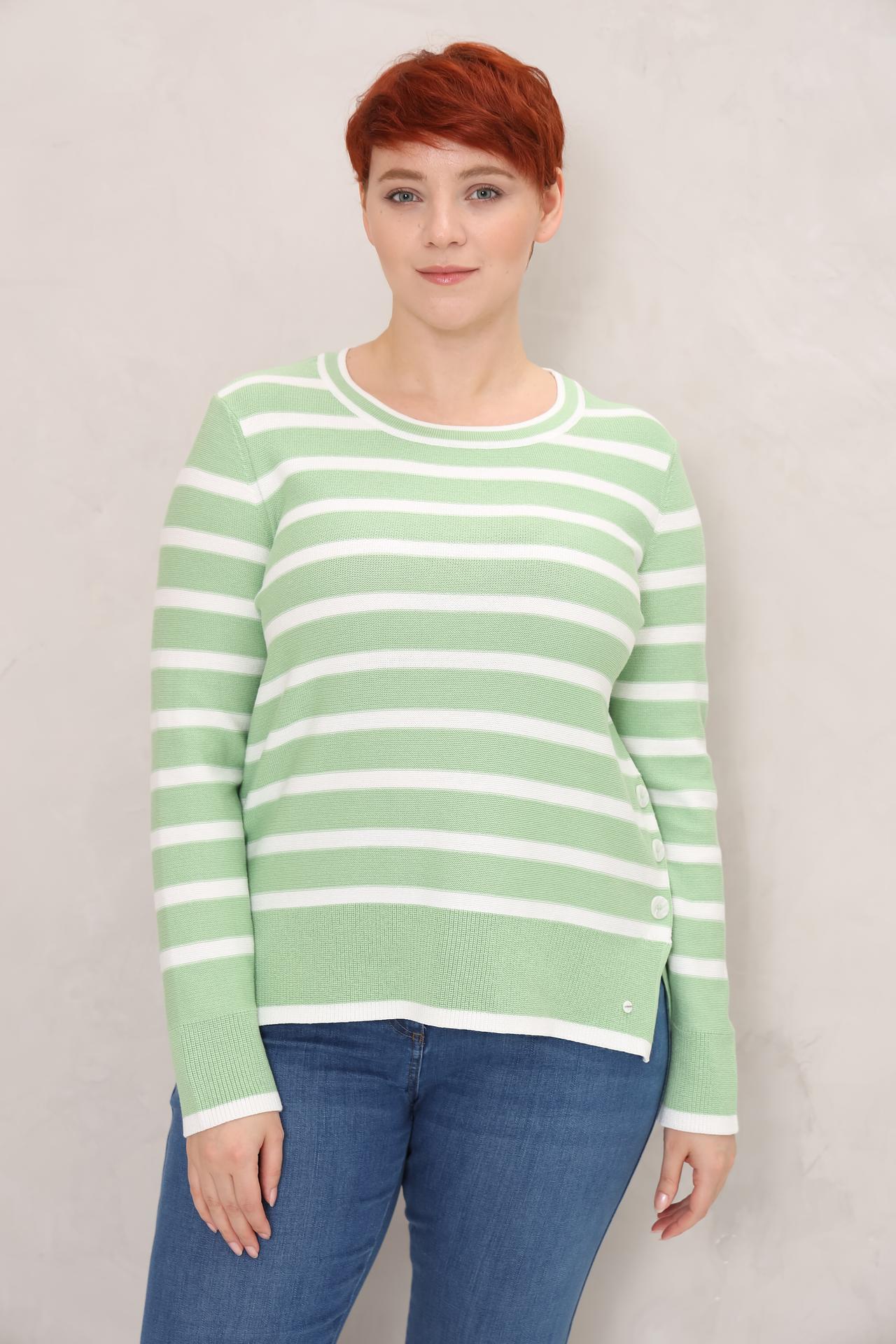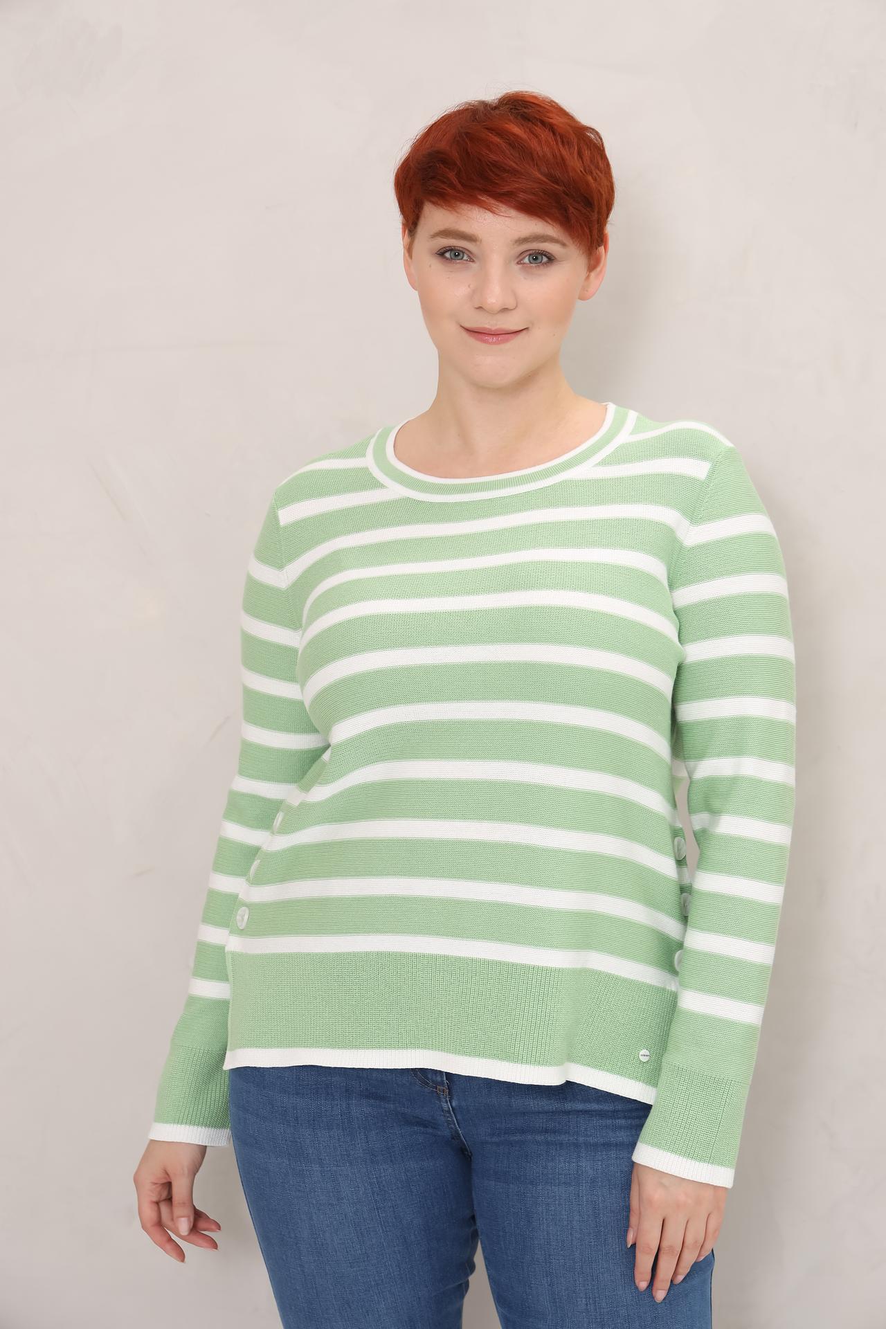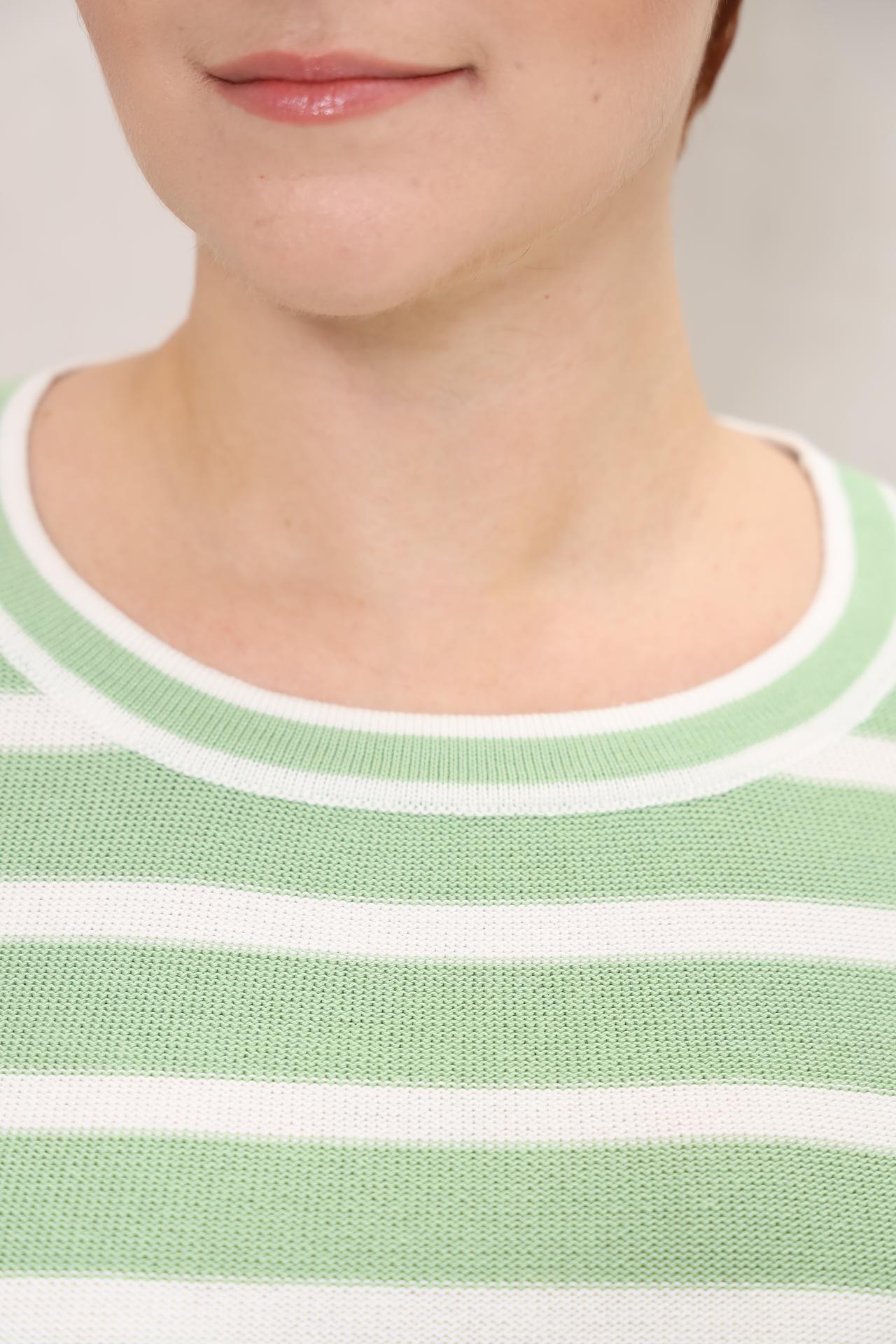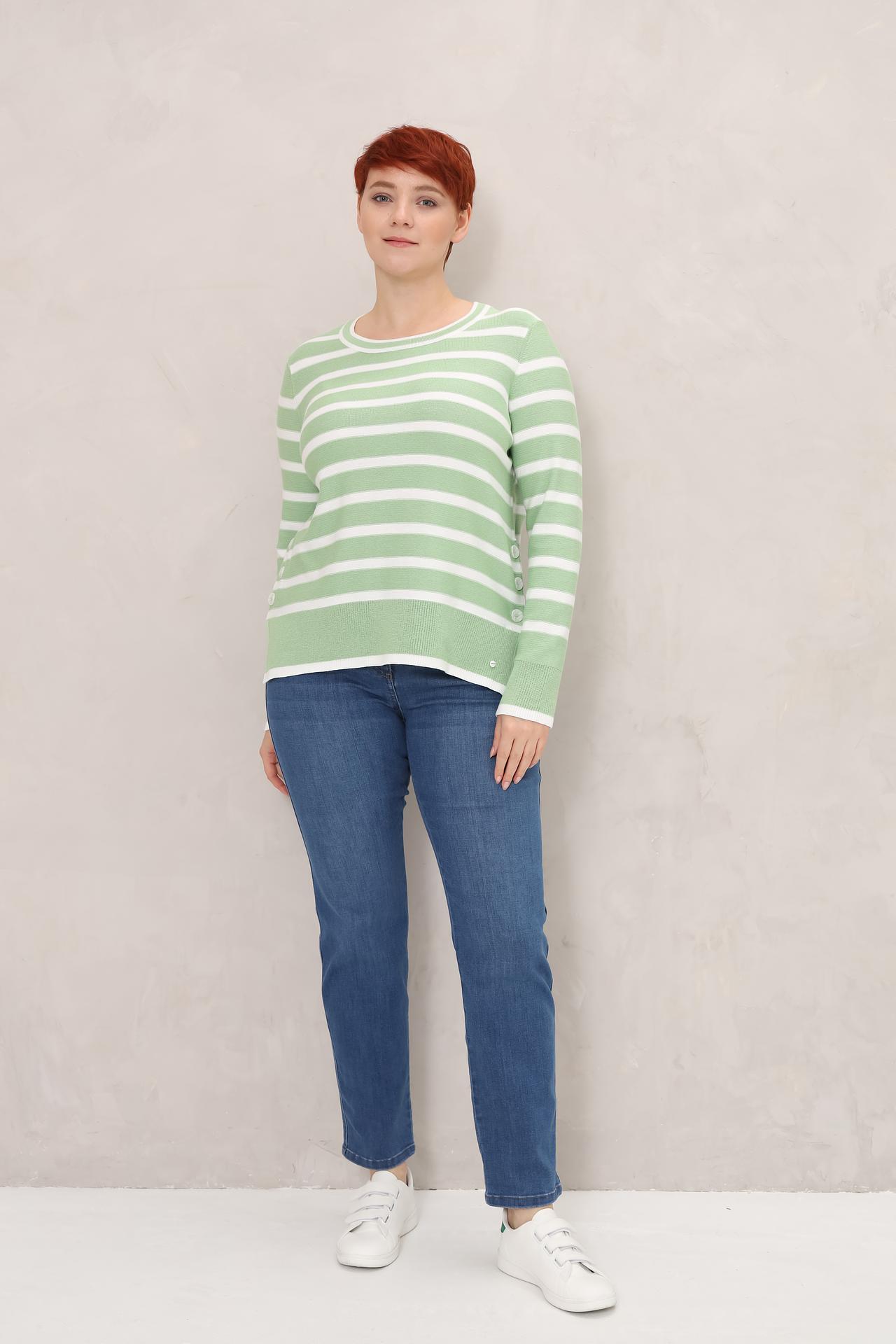 Мятный цвет в сочетании с белыми полосками добавляет свежести и легкости вашему образу, делая его актуальным и привлекательным. Стильный дизайн дополняют декоративные пуговицы на боковых швах, придающие изюминку.