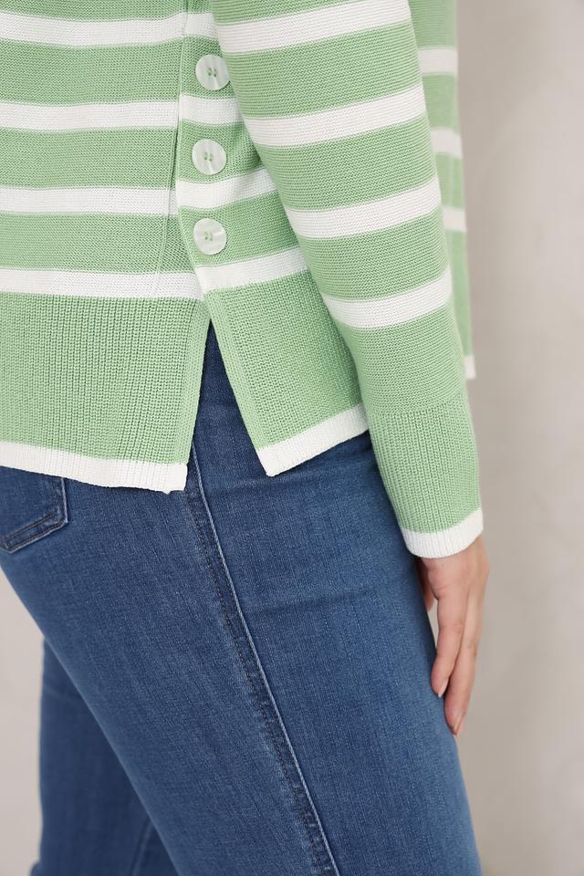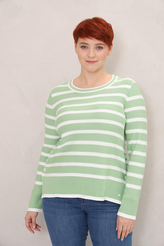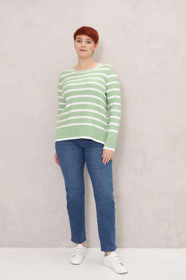 Женский пуловер Olsen мятного цвета в белоснежную полоску – стильное и комфортное решение для повседневного гардероба. Модель выполнена из мягкого трикотажа с добавлением акрила, имеет круглый вырез и застежку на пуговицы. Состав: хлопок 50%, полиакрил 50%