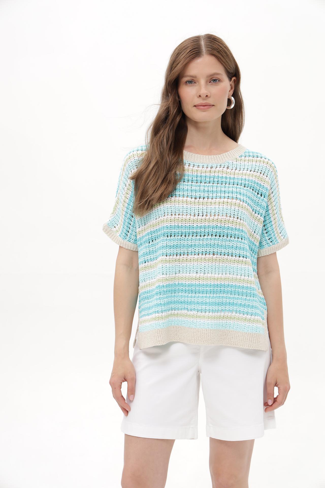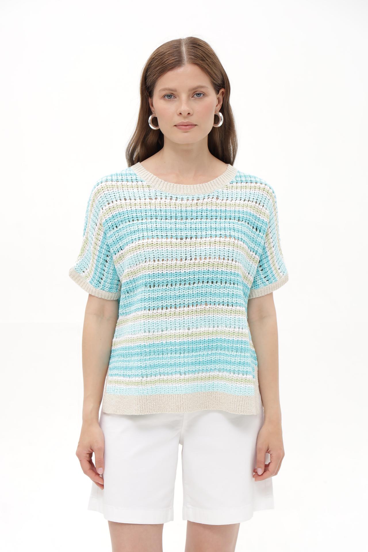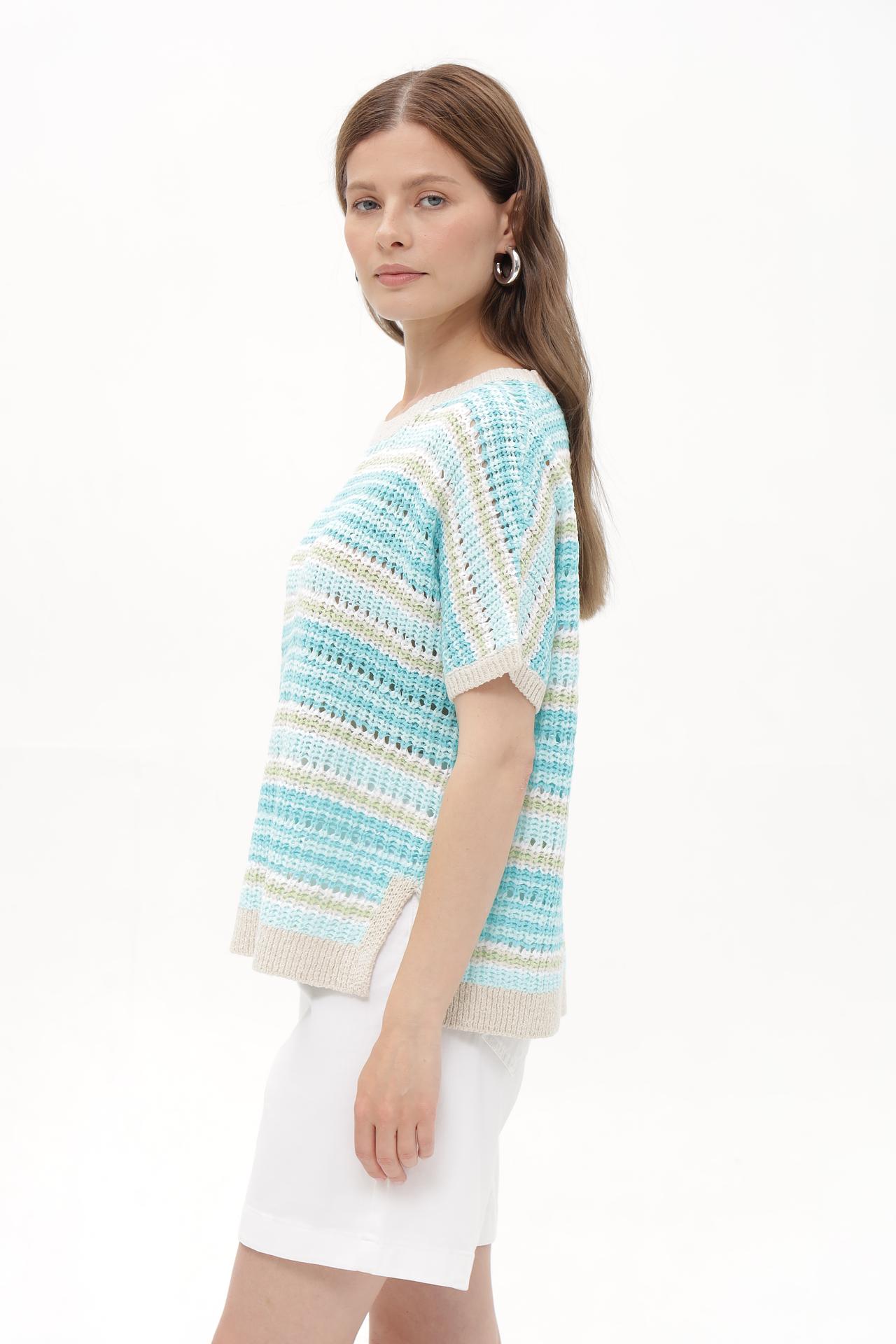 - Дизайн и узор: Пуловер украшен горизонтальными полосками различных оттенков, создающими свежий и динамичный образ. Открытая вязка придает изделию легкость и воздушность, делая его идеальным выбором для теплой погоды.