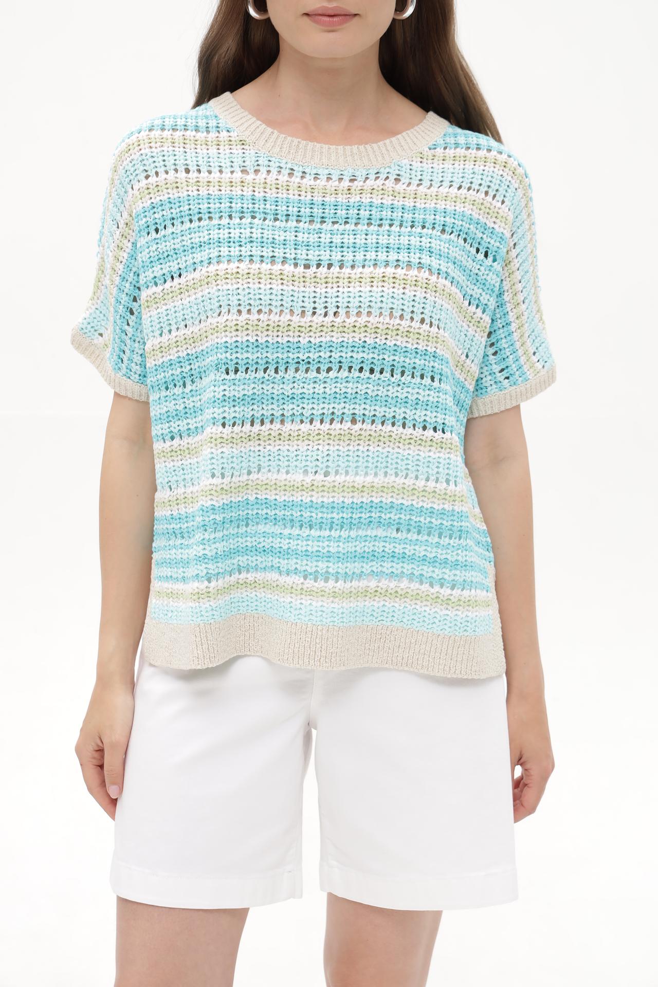 Легкий женский пуловер Olsen идеален для создания летних образов. Модель выполнена из тонкого вязаного трикотажа в яркую горизонтальную полоску, сочетающую оттенки голубого, бежевого и зеленого. Свободный крой и спущенная линия плеча обеспечивают комфорт и непринужденный вид.
