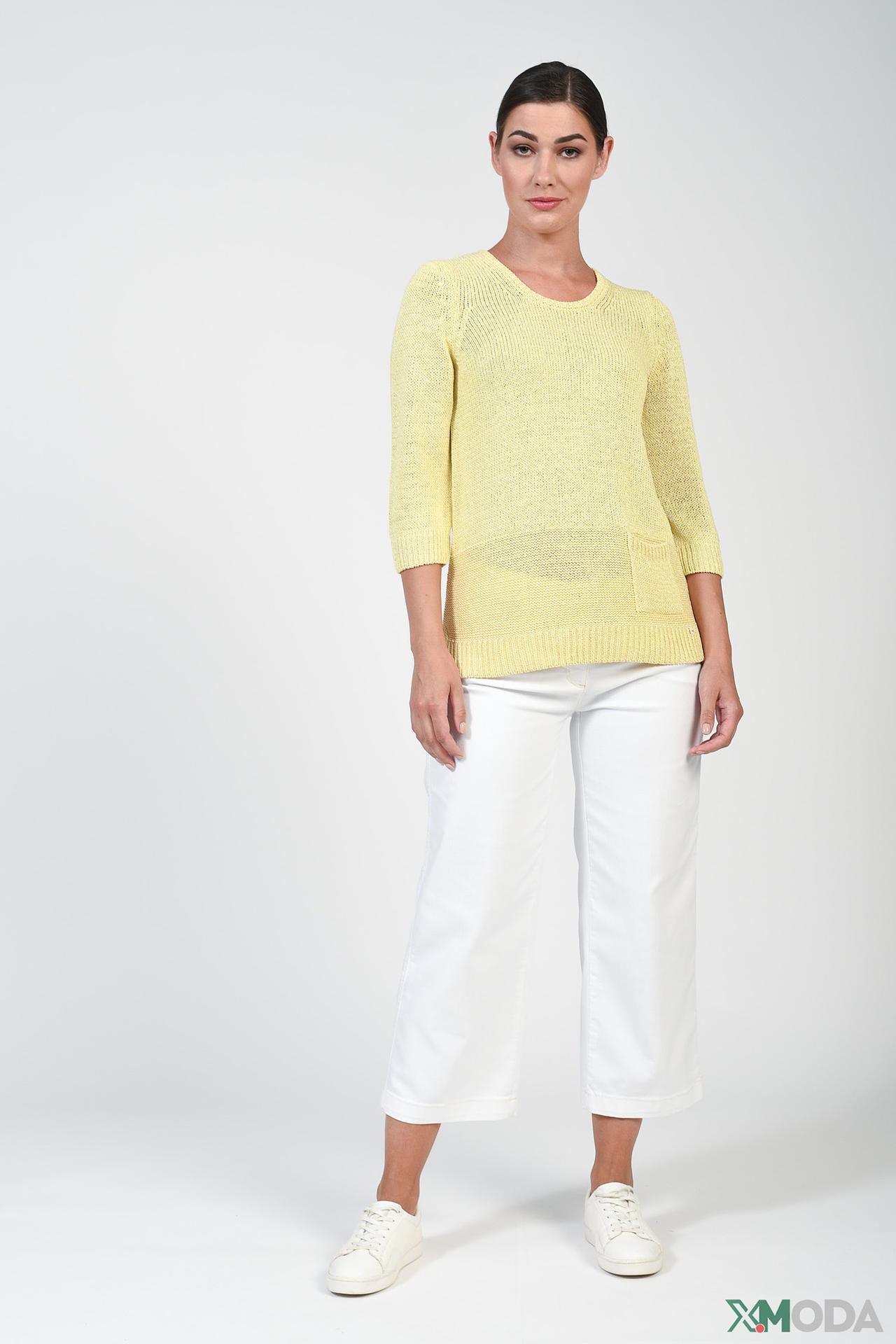Этот вязаный пуловер с рукавами три четверти и круглым вырезом горловины отлично сочетается с джинсами, брюками или юбкой, обеспечивая универсальность в создании модных комплектов. Оригинальная деталь – накладной карман, добавляющий изюминку в дизайн.