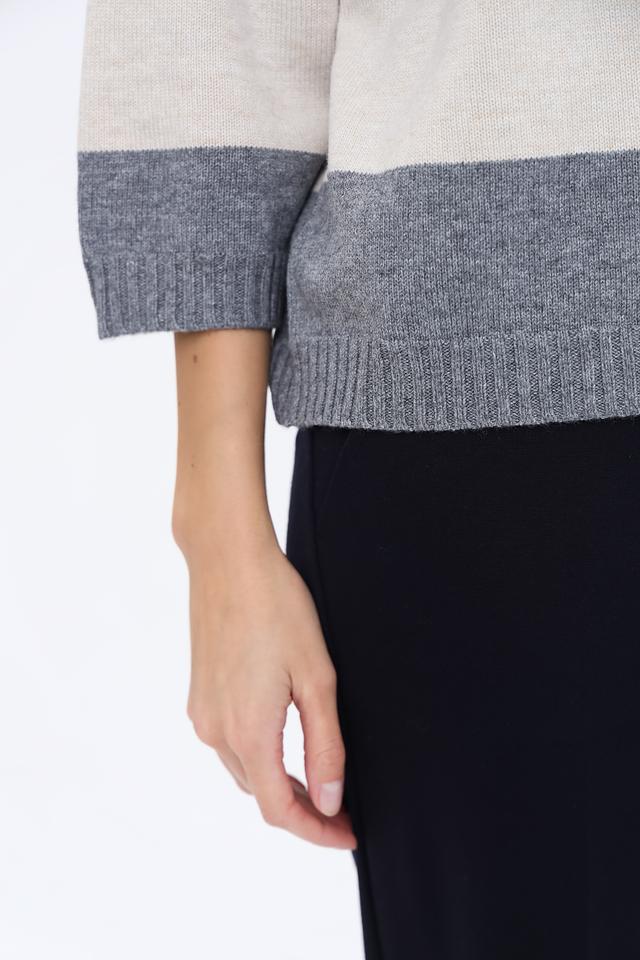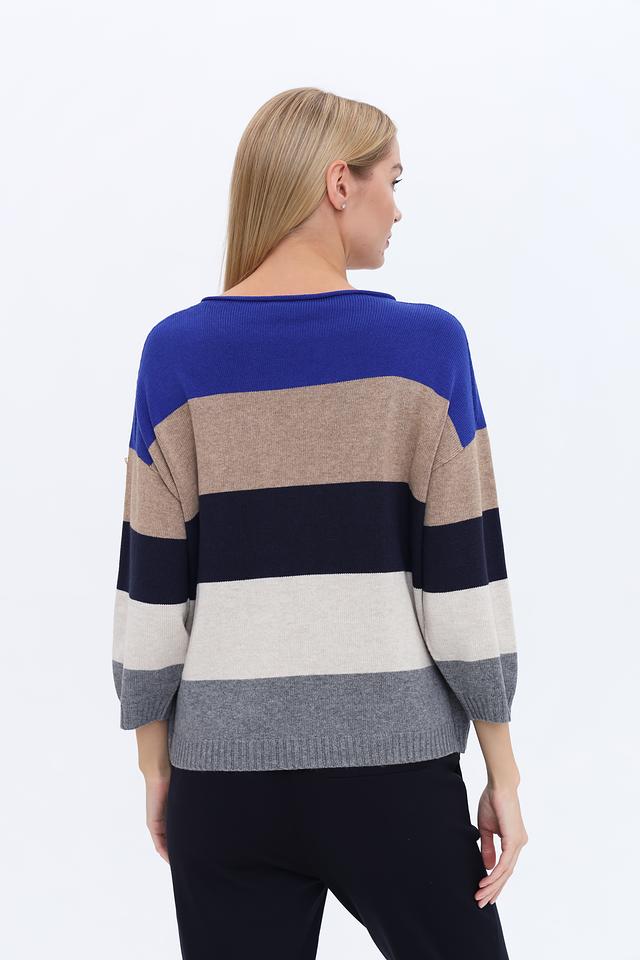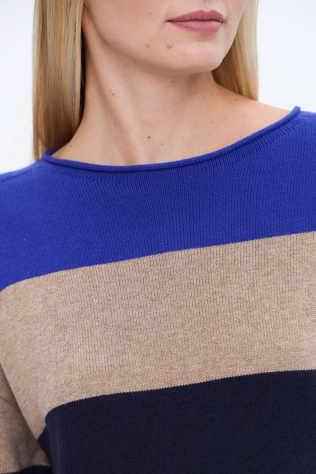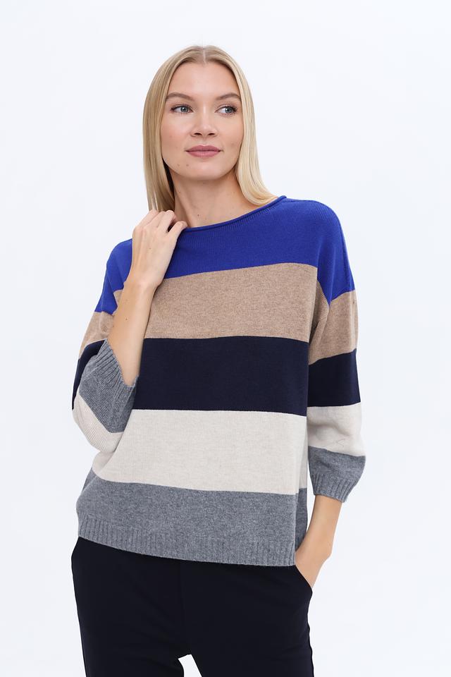Дизайн пуловера выполнен в виде горизонтальных полос синего, бежевого и серого цветов, что придает ему современный и стильный вид. Круглый вырез горловины и рукава ¾ делают его универсальным для различных случаев.