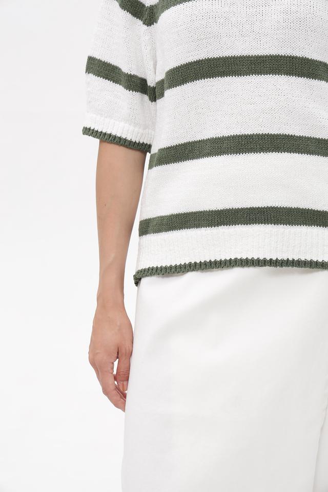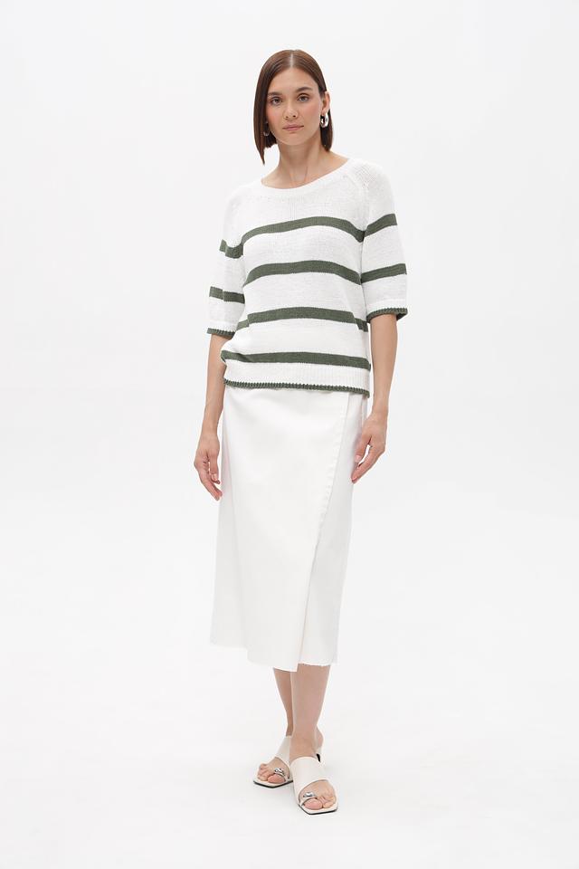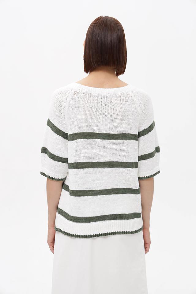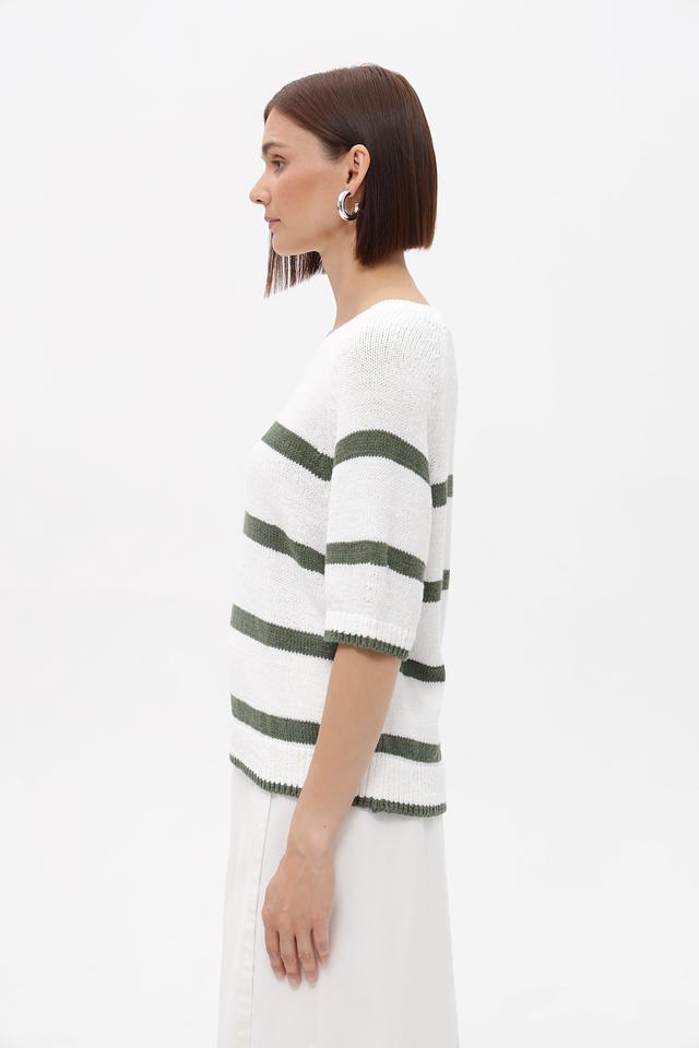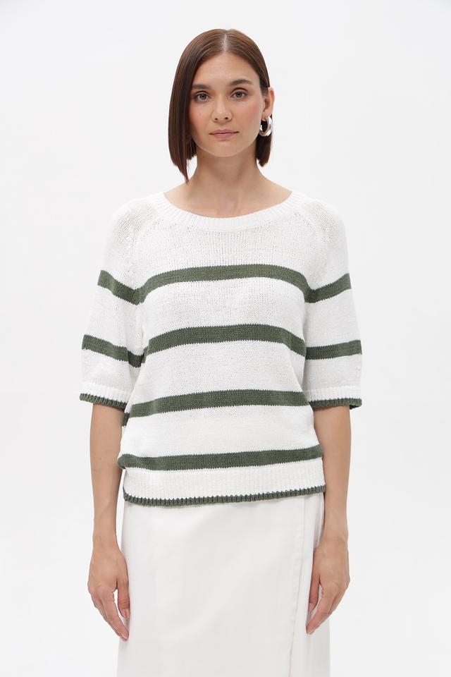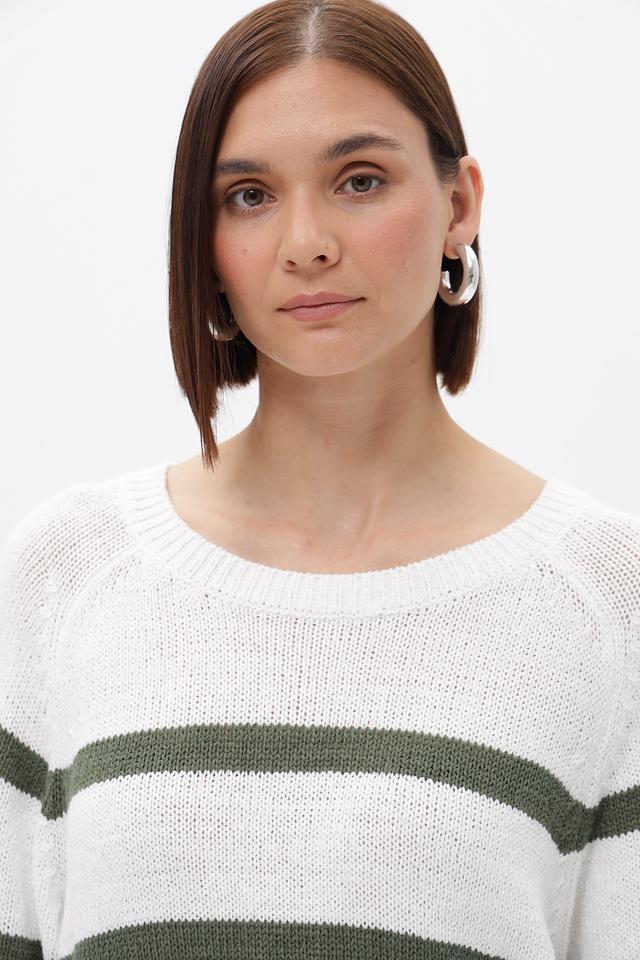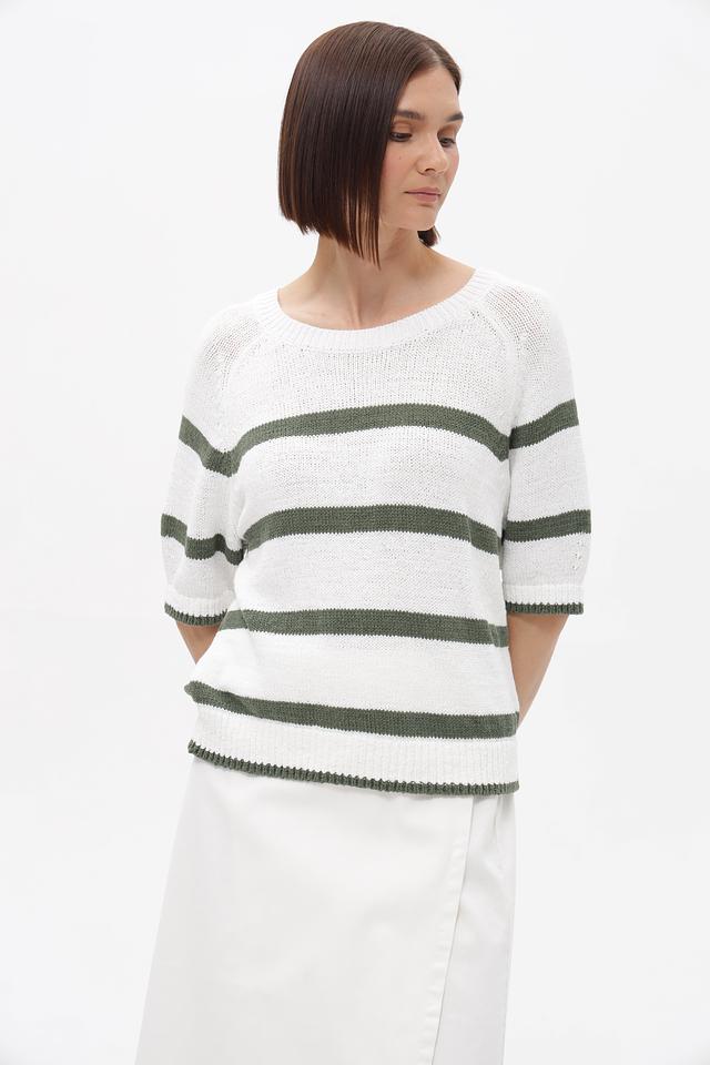 Основным элементом дизайна является горизонтальная полоска, сочетающая белый и приглушенный оливковый цвета. Такое сочетание делает пуловер универсальным и легко сочетающимся с различными элементами гардероба.
