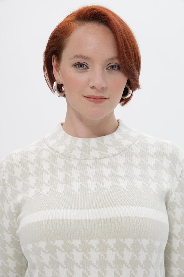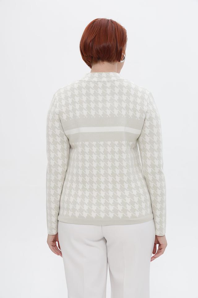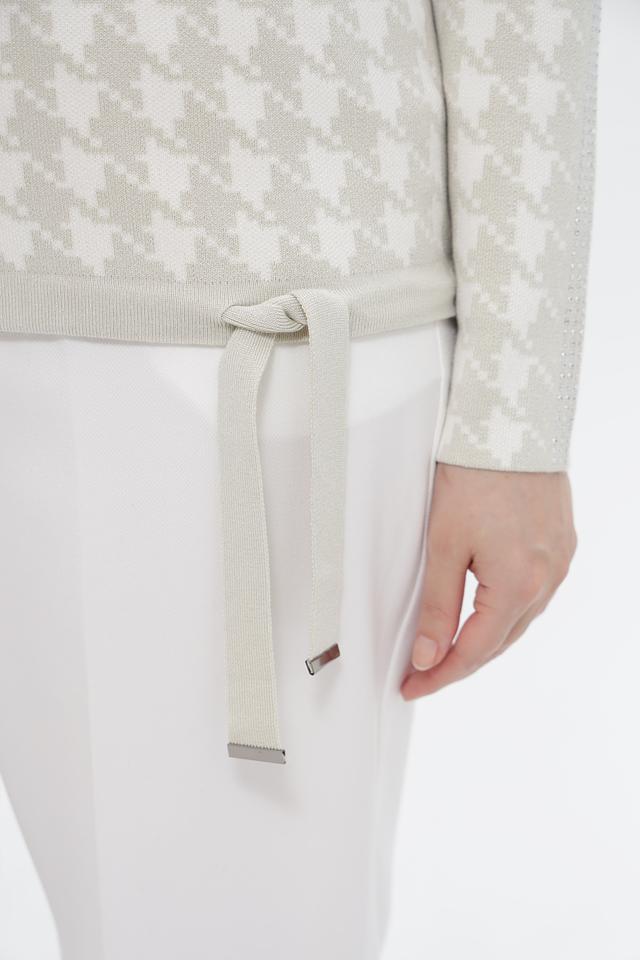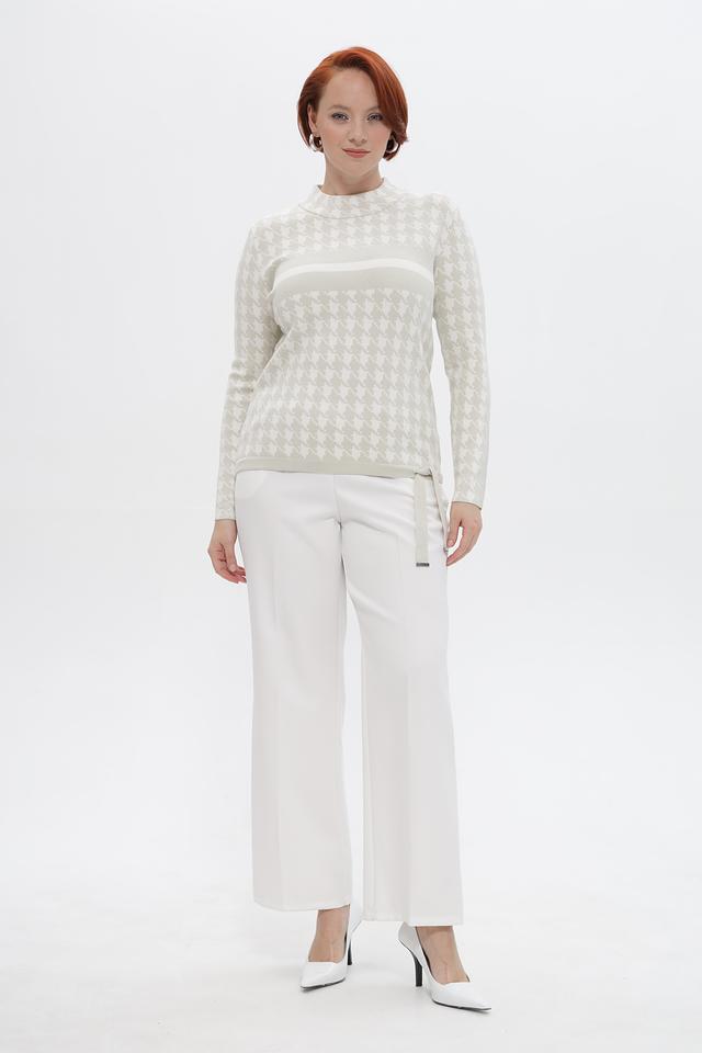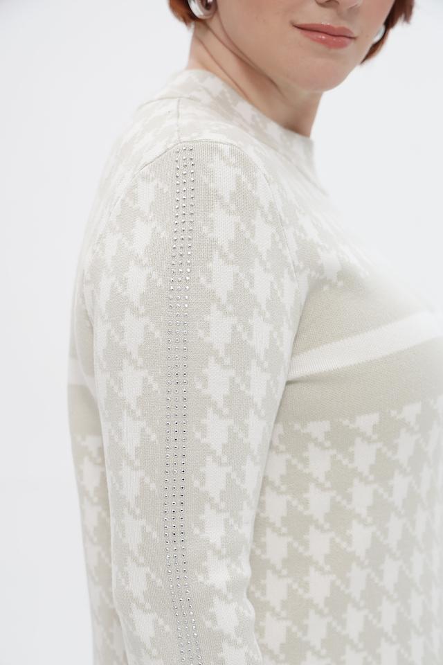 Этот стильный пуловер от Passioni выполнен в бежевых тонах с классическим принтом «гусиная лапка», придающим образу элегантность и изысканность.
