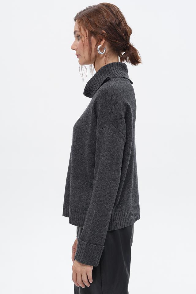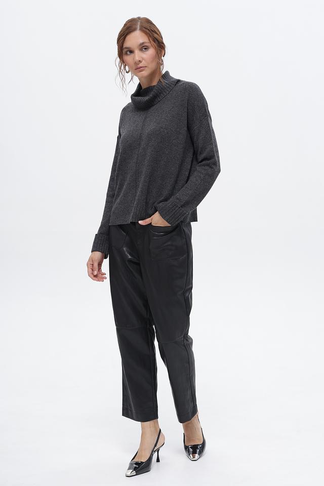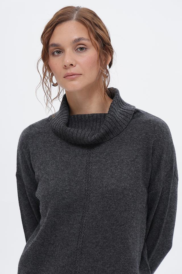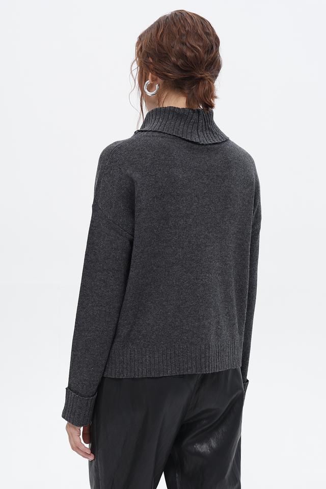 Модель имеет высокий горл, который не только согревает в прохладную погоду, но и придает образу элегантность. Свободный крой обеспечивает комфорт при носке, а трикотажная текстура приятна к телу.