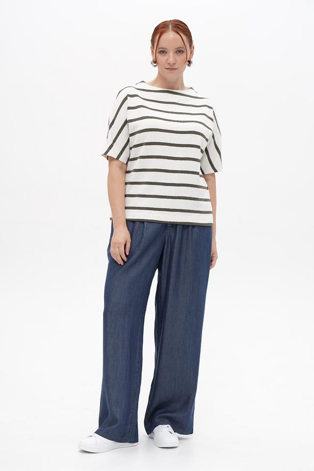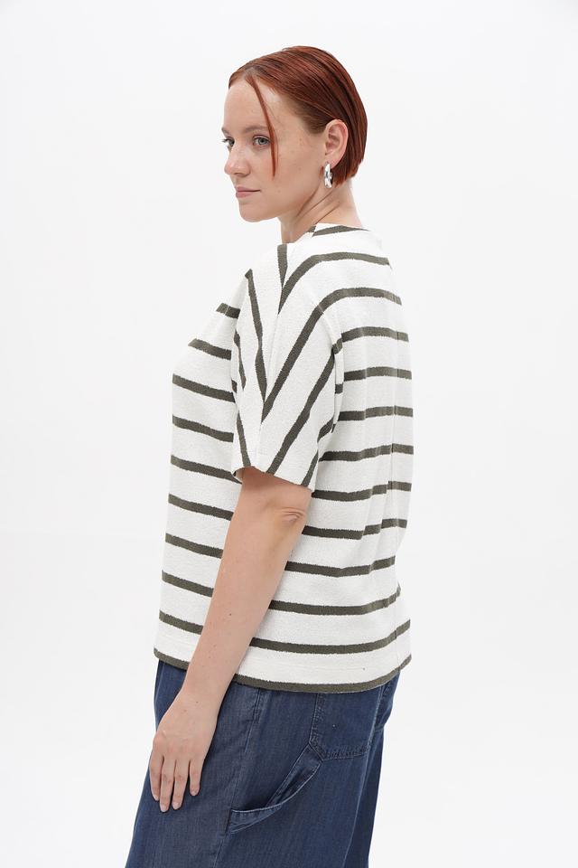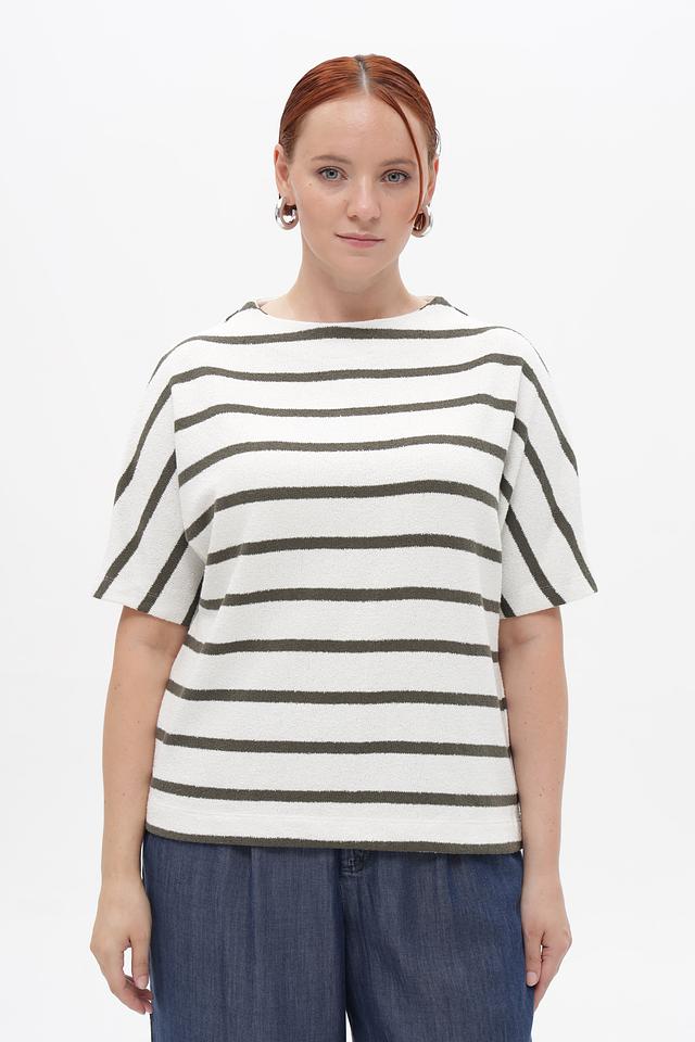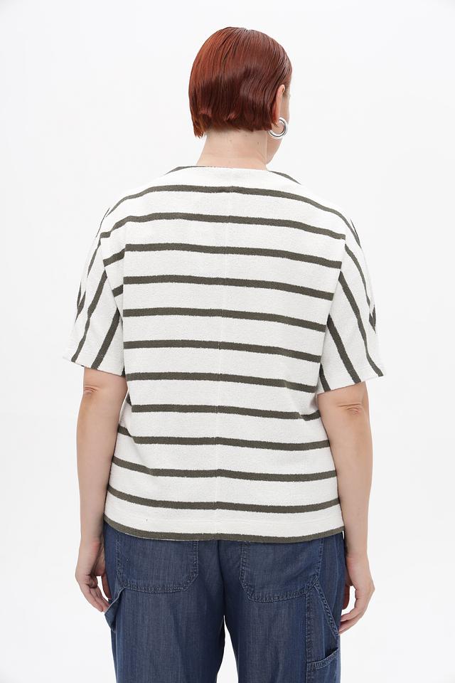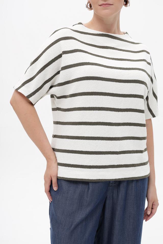 Женский пуловер Rabe collection белого и оливкового цвета с коротким рукавом и горизонтальной полоской. Модель выполнена из мягкого и приятного к телу трикотажа, идеально подходит для создания повседневных образов. Состав: хлопок 50%, модал 30%, полиэстер 20%
