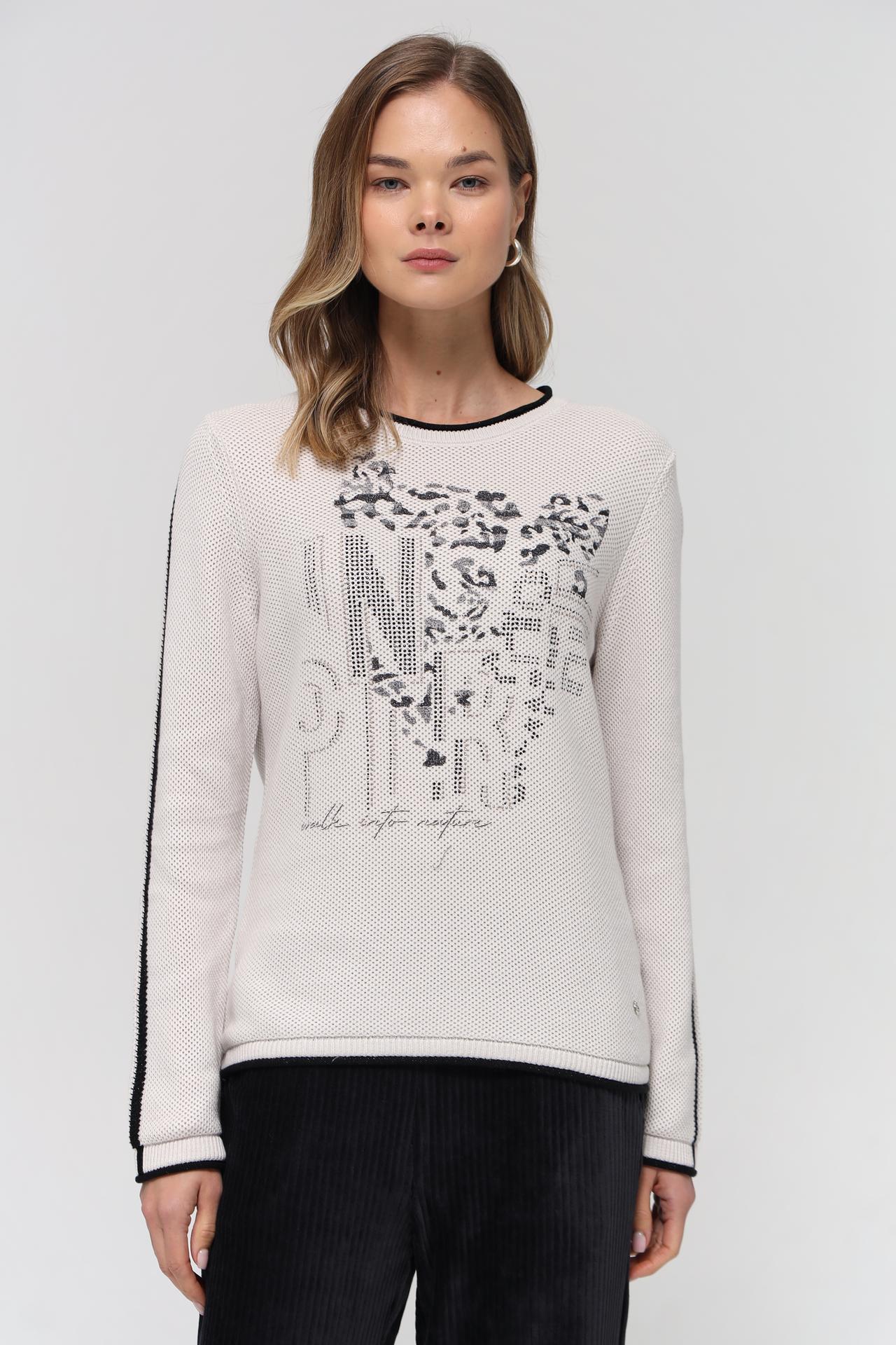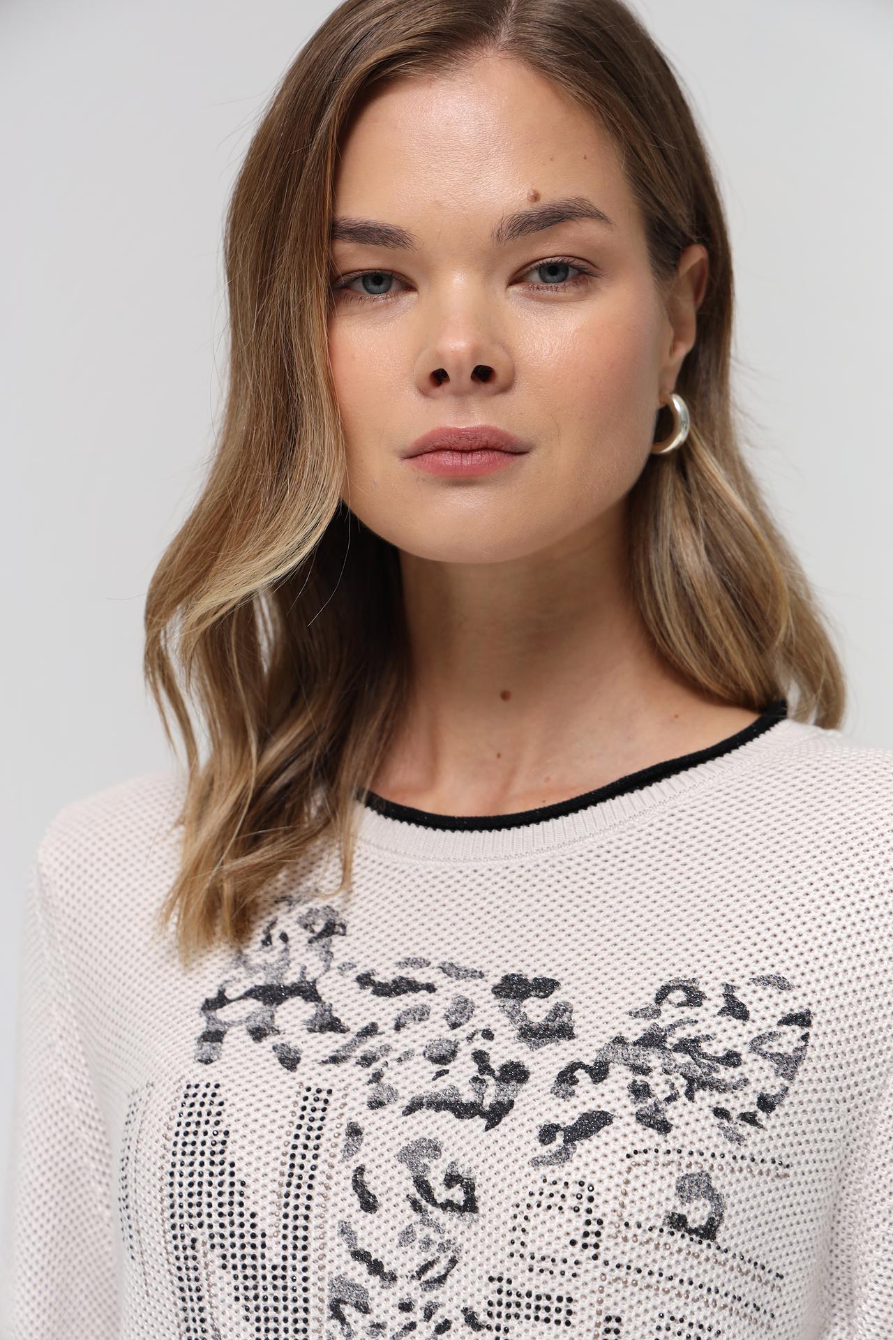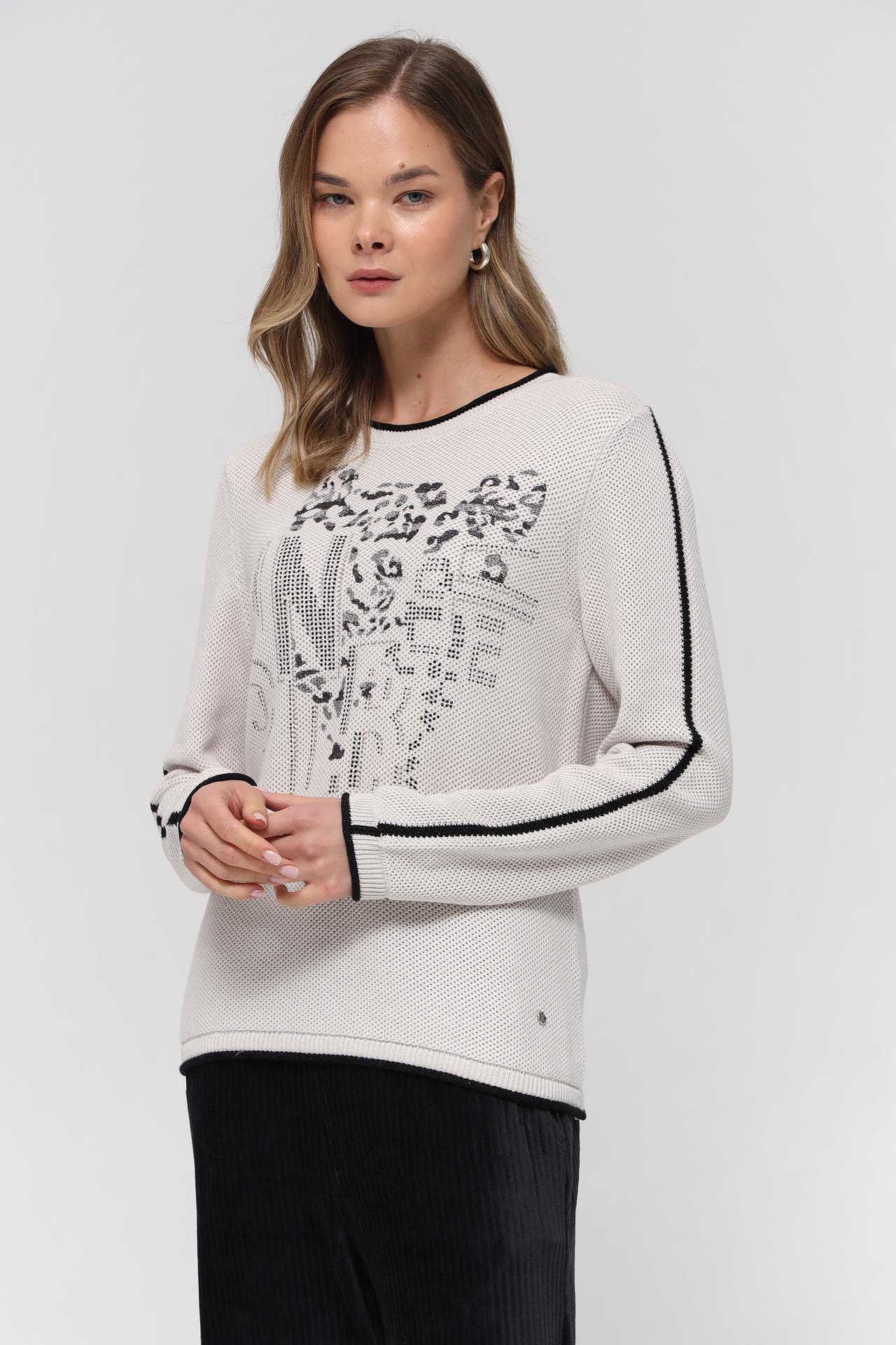 Оригинальный дизайн пуловера подчеркивает эффектный леопардовый принт на груди, выполненный в черно-серых тонах, и декоративные полосы на рукавах, добавляющие динамичности. Контрастные черные окантовки по вороту, манжетам и низу изделия создают завершенный и выразительный вид. Этот джемпер прекрасно сочетается как с классическими брюками и юбками, так и с джинсами.