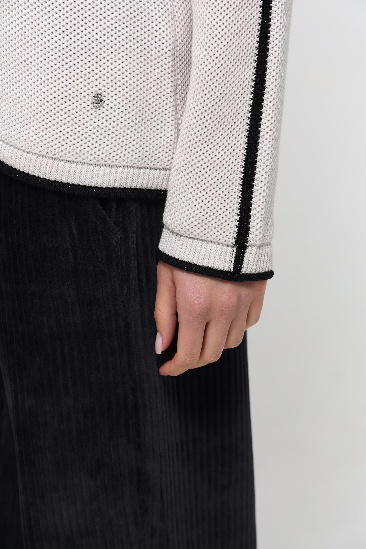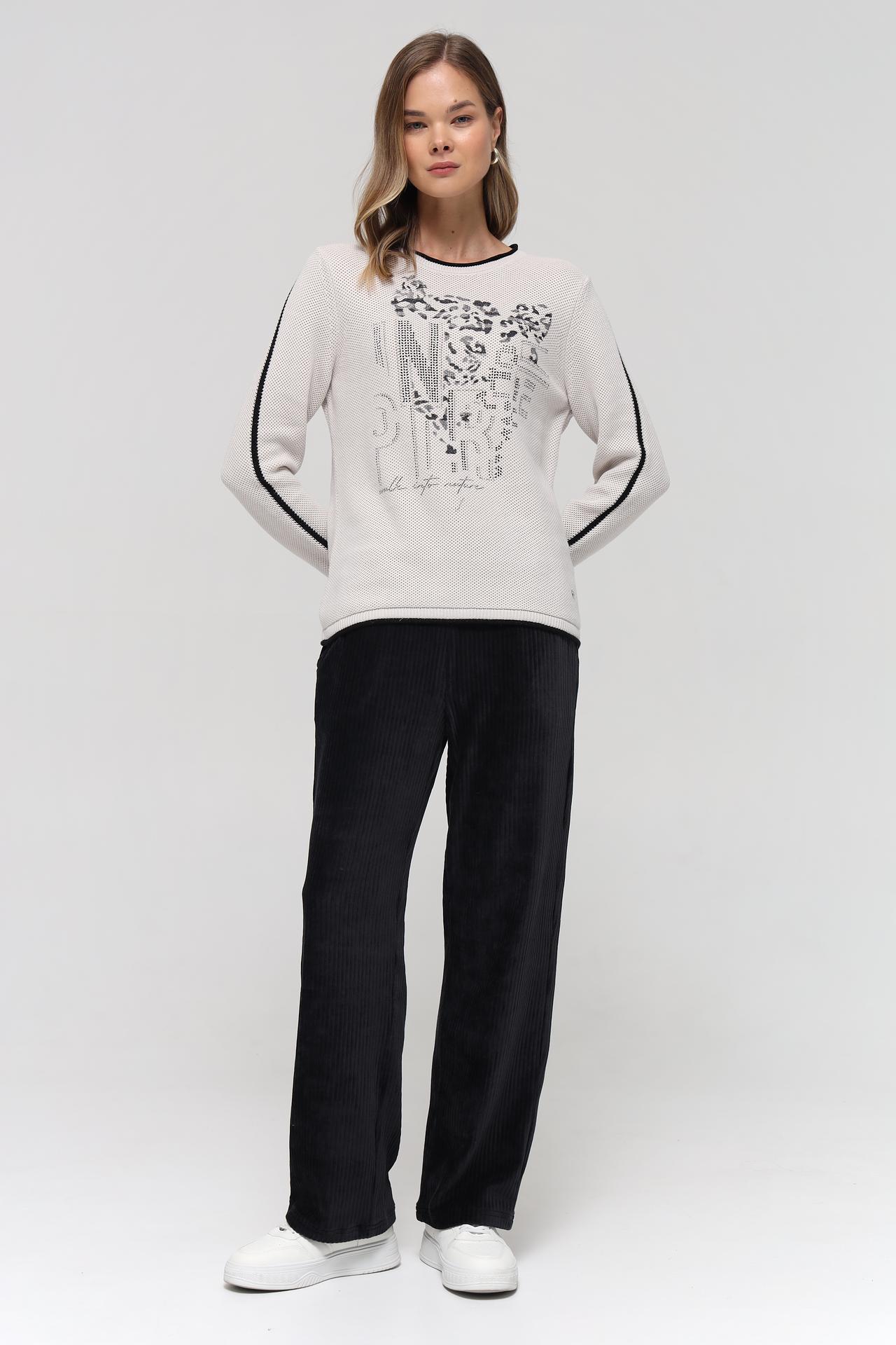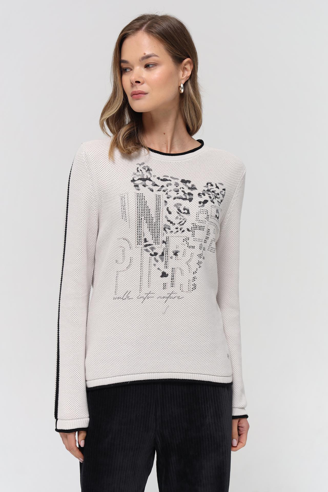 Оригинальный дизайн пуловера подчеркивает эффектный леопардовый принт на груди, выполненный в черно-серых тонах, и декоративные полосы на рукавах, добавляющие динамичности. Контрастные черные окантовки по вороту, манжетам и низу изделия создают завершенный и выразительный вид. Этот джемпер прекрасно сочетается как с классическими брюками и юбками, так и с джинсами.