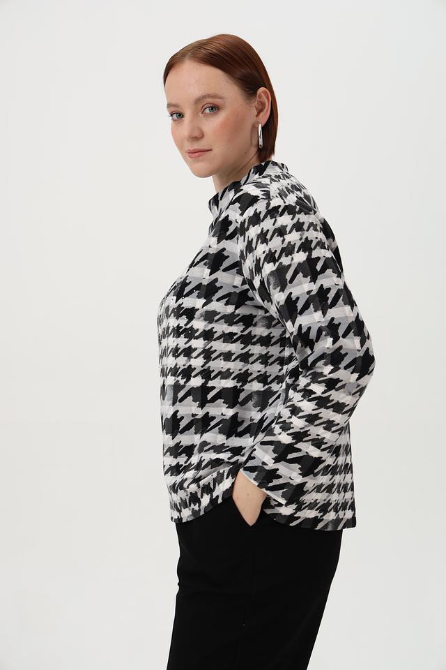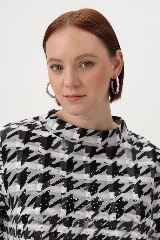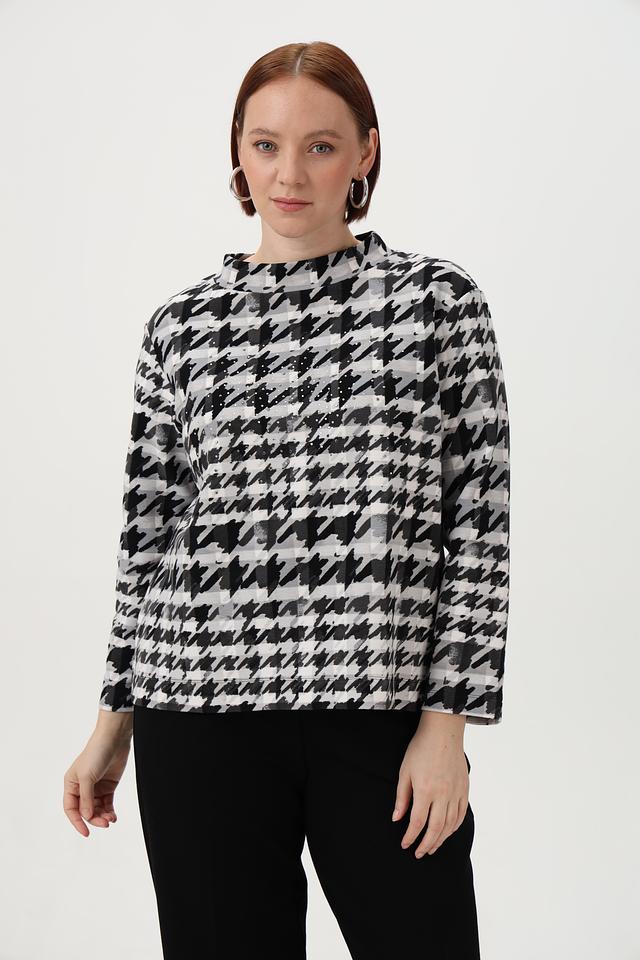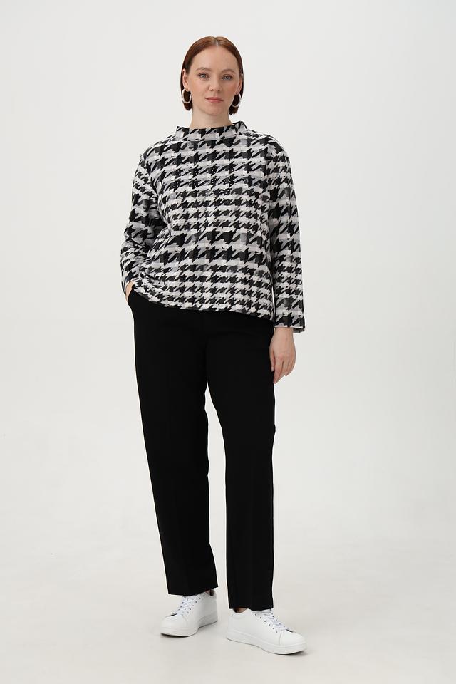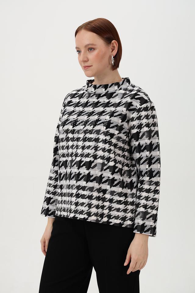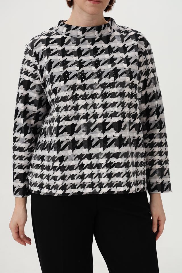 Стильный пуловер от Rabe collection серого цвета с актуальным принтом "гусиная лапка". Изготовлен из мягкого и приятного к телу трикотажа, содержащего хлопок, полиэстер и эластан. Состав: хлопок 76%, полиэстер 16%, эластан 8%