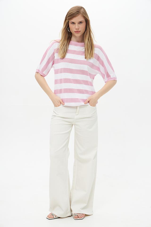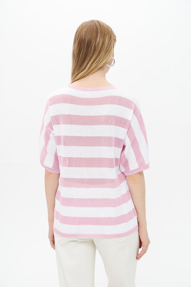 Пуловер имеет прямой, слегка свободный крой, который обеспечивает комфортную посадку по фигуре. Короткие рукава делают его идеальным выбором для теплой погоды, а круглый вырез горловины подчеркивает элегантность силуэта.