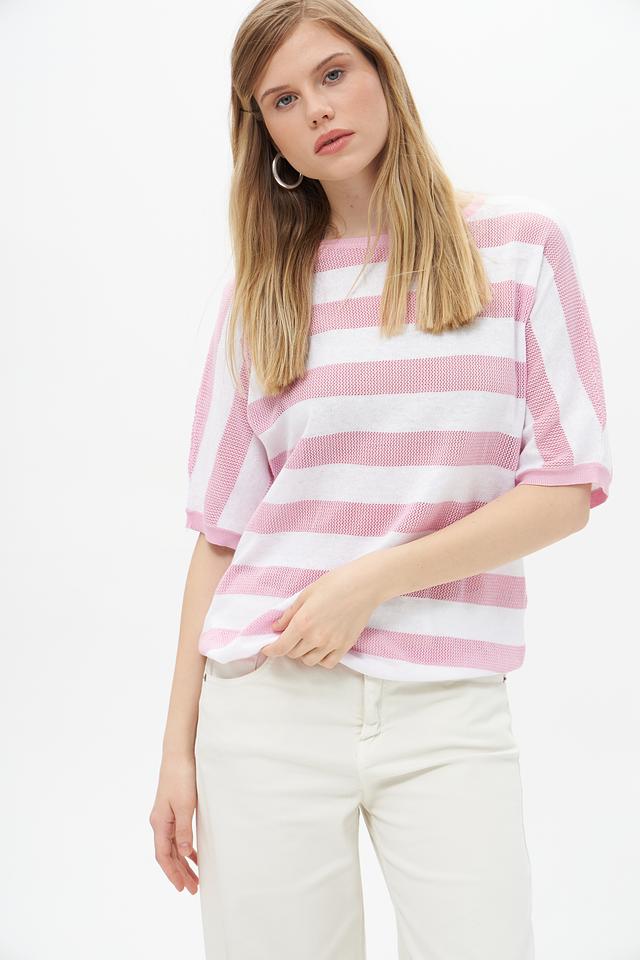 Представляем стильный женский пуловер от бренда Rabe collection. Модель выполнена в нежном розовом цвете с классической белоснежной полоской, что придает ей свежий и актуальный вид.