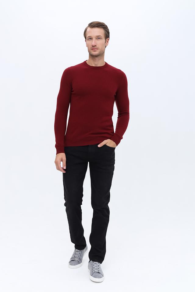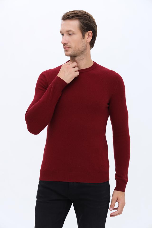 Джемпер имеет классический крой с круглым вырезом горловины и длинными рукавами. Однотонный бордовый цвет делает его универсальным и легко сочетаемым с различными элементами гардероба. Текстура вязки однородная, без выраженных узоров.
