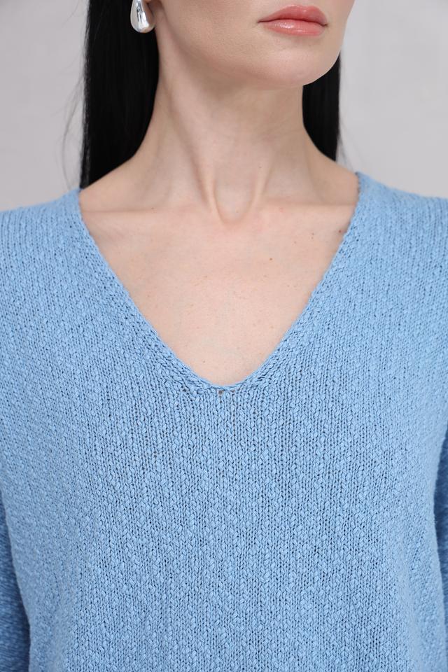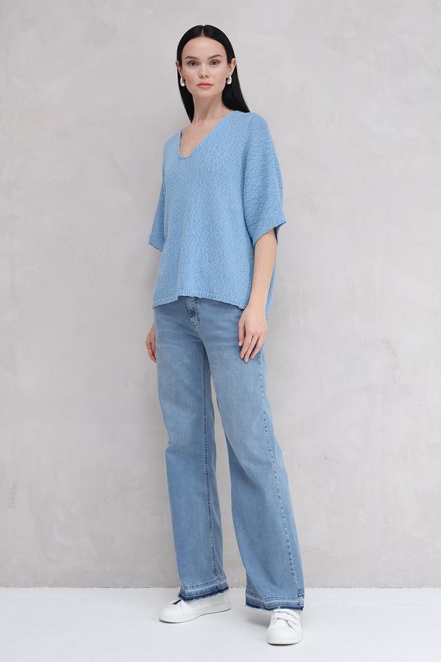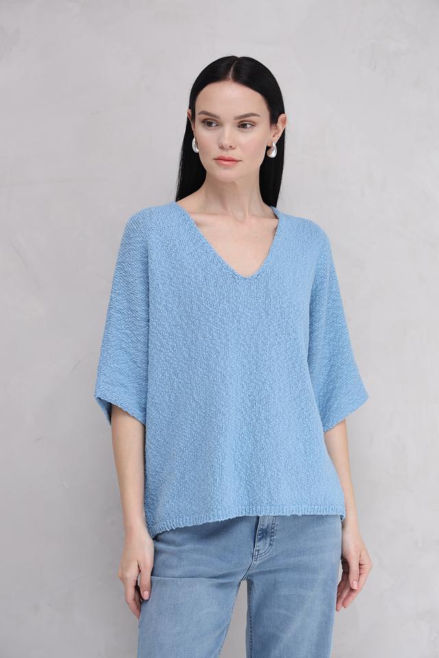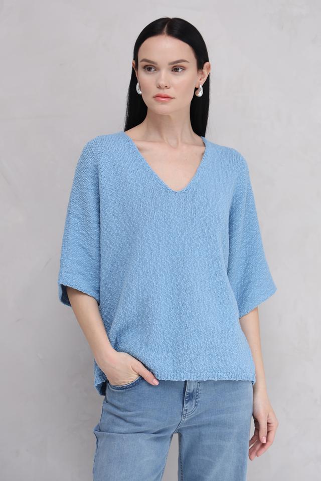 Пуловер имеет свободный крой, который не сковывает движений и обеспечивает комфортную посадку по фигуре. V-образный вырез подчеркивает линию шеи и делает образ более женственным. Короткий рукав 3/4 идеально подходит для теплой погоды.