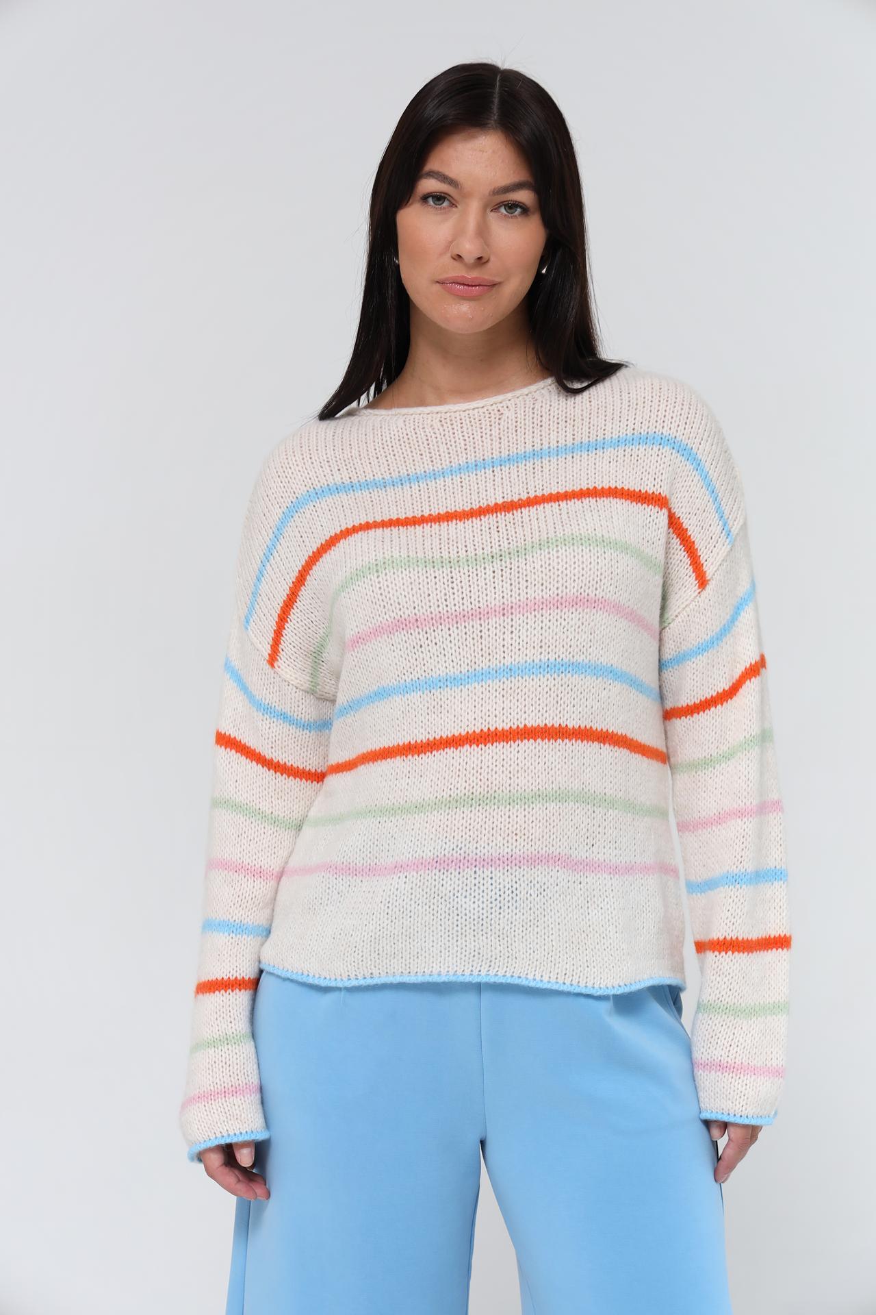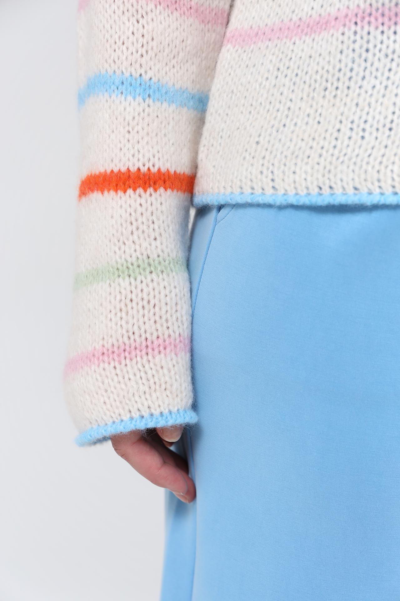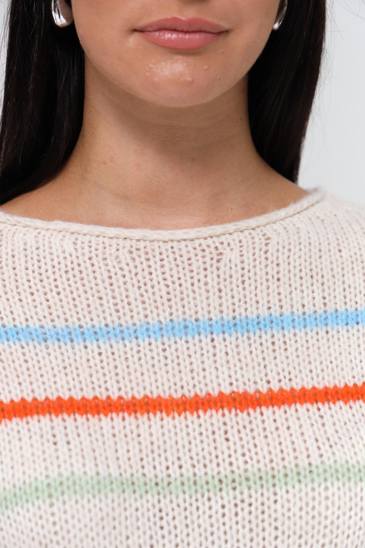 Пуловер молочного цвета с яркими разноцветными полосками – это не просто одежда, это заявление о вашем безупречном вкусе и чувстве стиля. Подчеркните свою индивидуальность с этой модной новинкой!