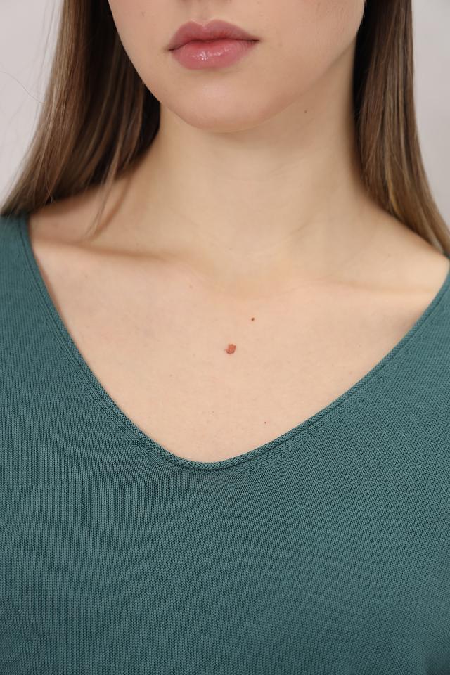 Модель имеет классический крой с V-образным вырезом, который визуально удлиняет шею и делает образ более элегантным. Длинные рукава обеспечивают комфорт в прохладную погоду.