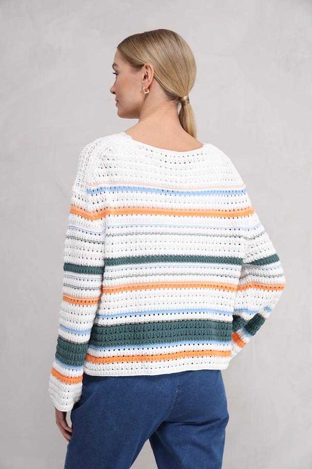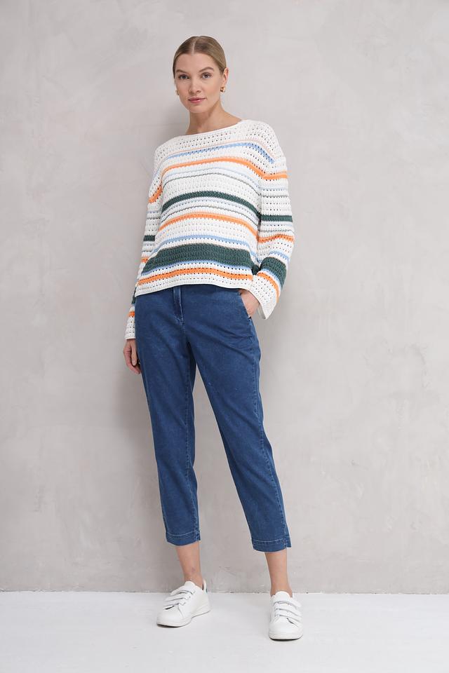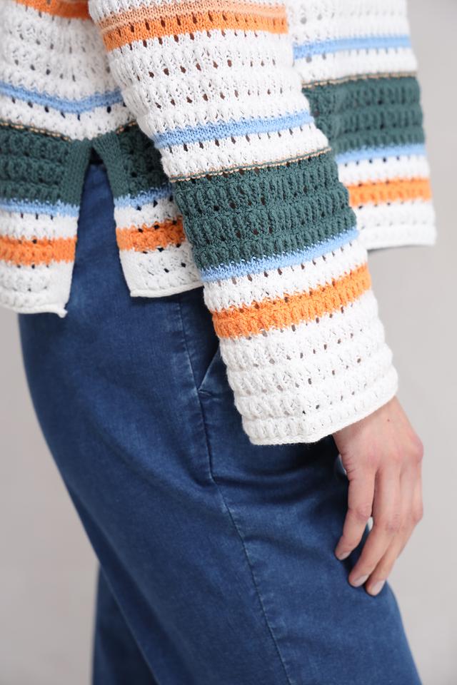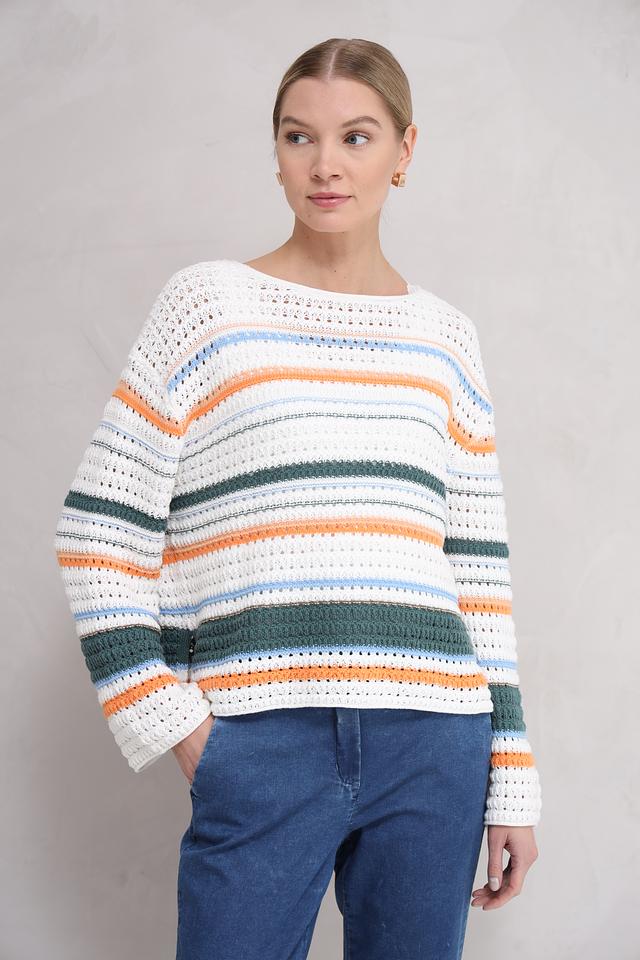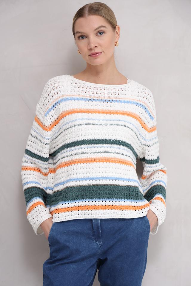 Этот стильный пуловер от Tom Tailor выполнен в полоску, сочетающую белый цвет с яркими акцентами оранжевого, голубого и зеленого. Модель имеет свободный крой, который обеспечивает комфорт и свободу движений.