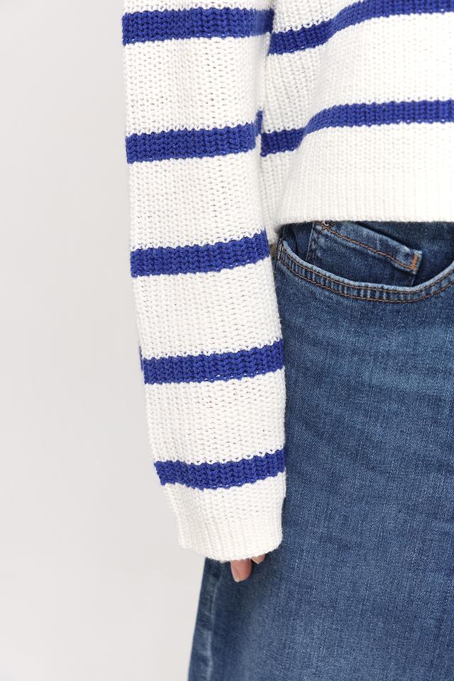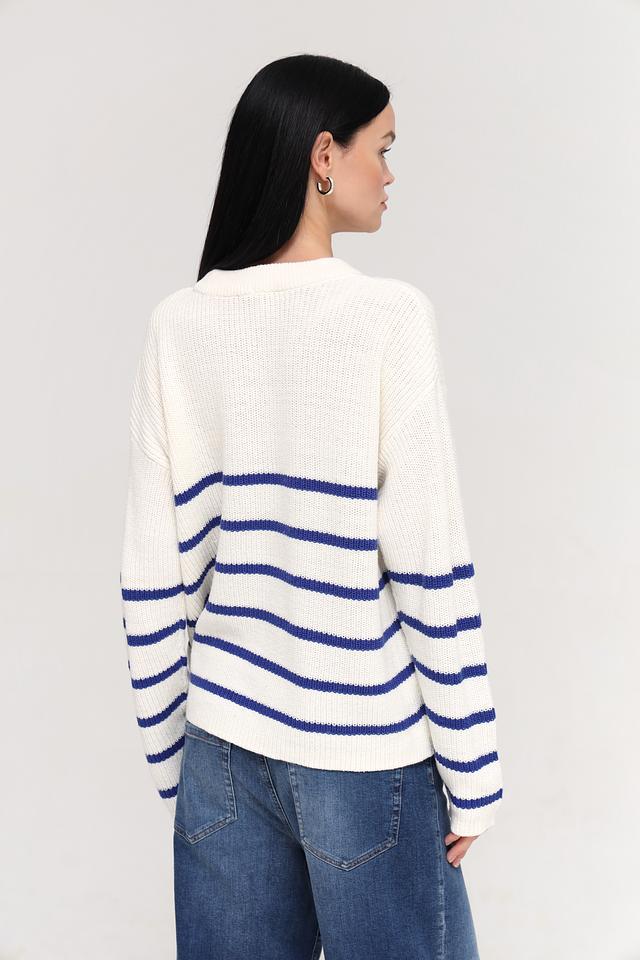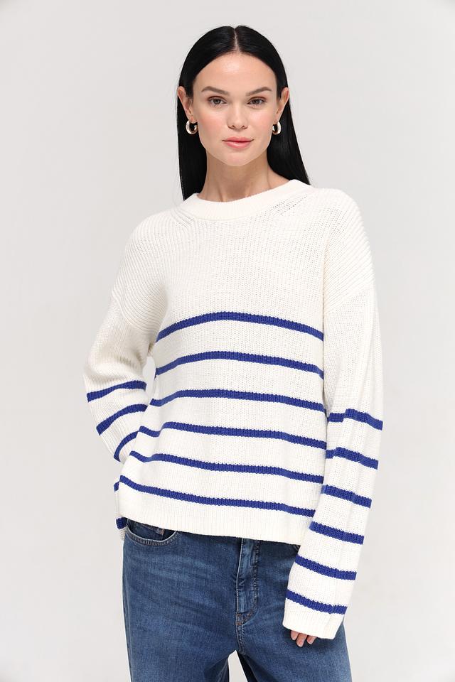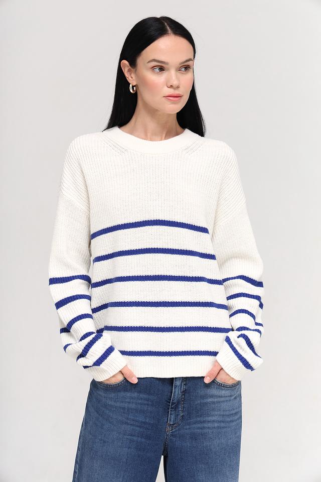 Женский пуловер Tom Tailor белого цвета с синими полосками. Изготовлен из мягкого хлопка с добавлением полиакрила для комфорта и долговечности. Состав: хлопок 60%, полиакрил 40%