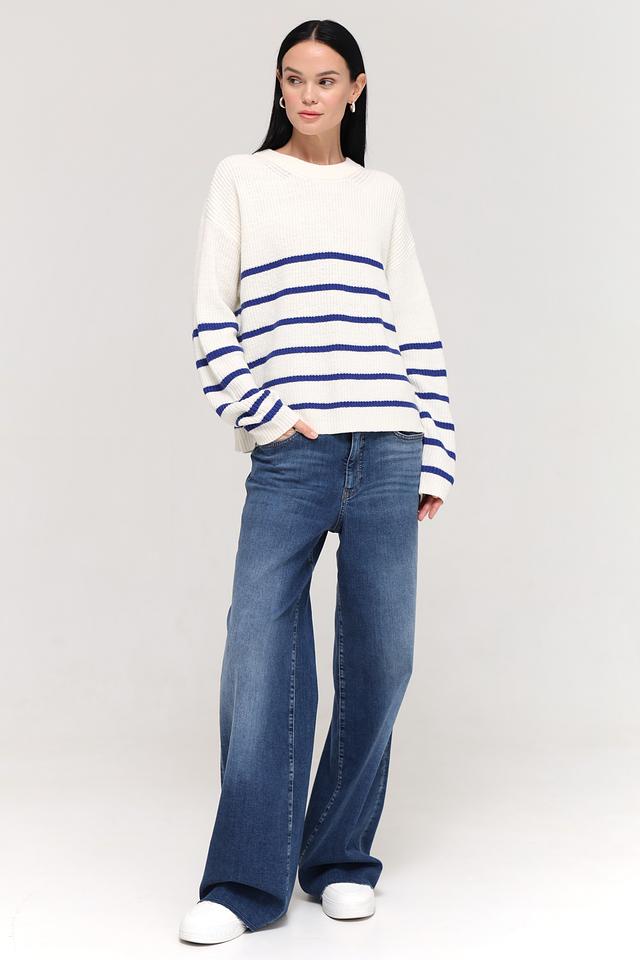 Дизайн пуловера лаконичен и элегантен. Широкие горизонтальные полосы придают ему динамичный вид. Пуловер имеет круглый вырез горловины и длинные рукава. Он идеально сочетается с джинсами, брюками или юбками.