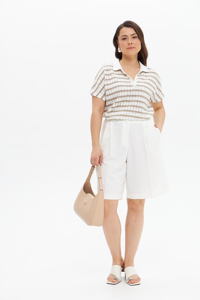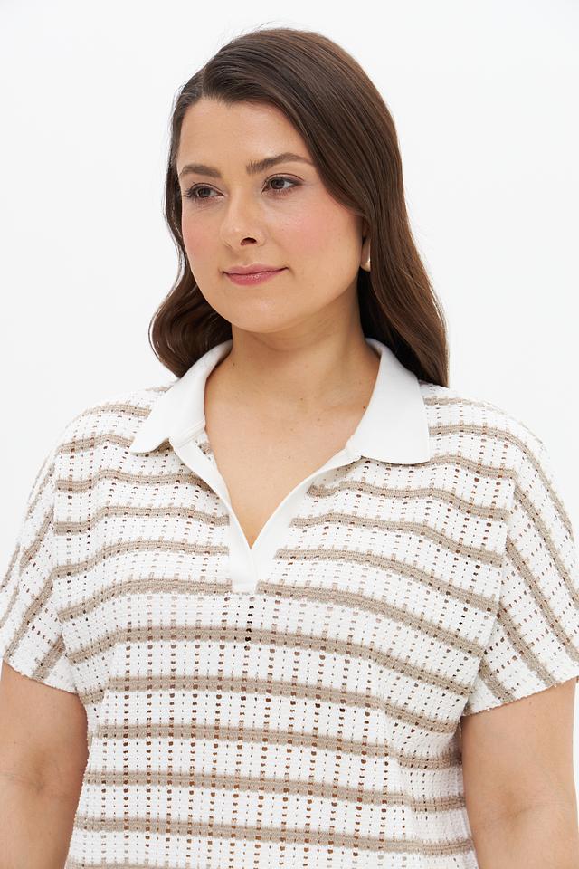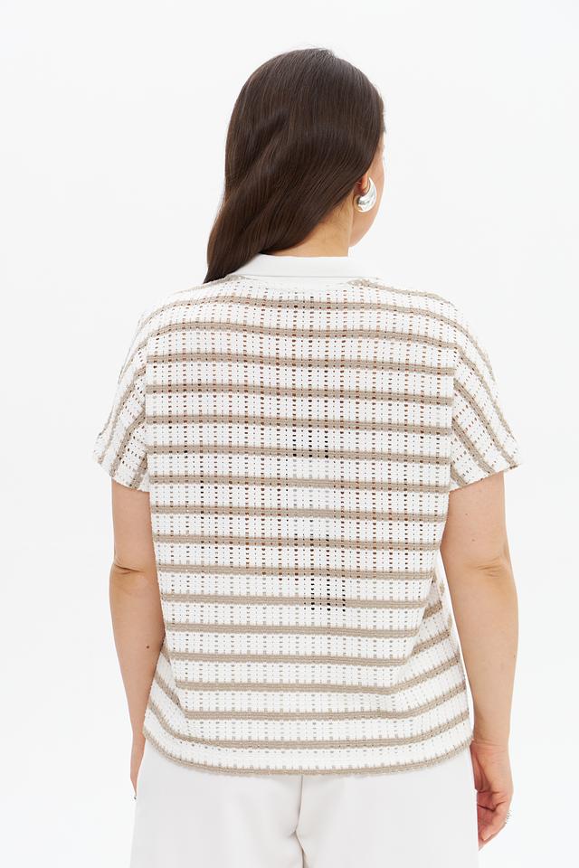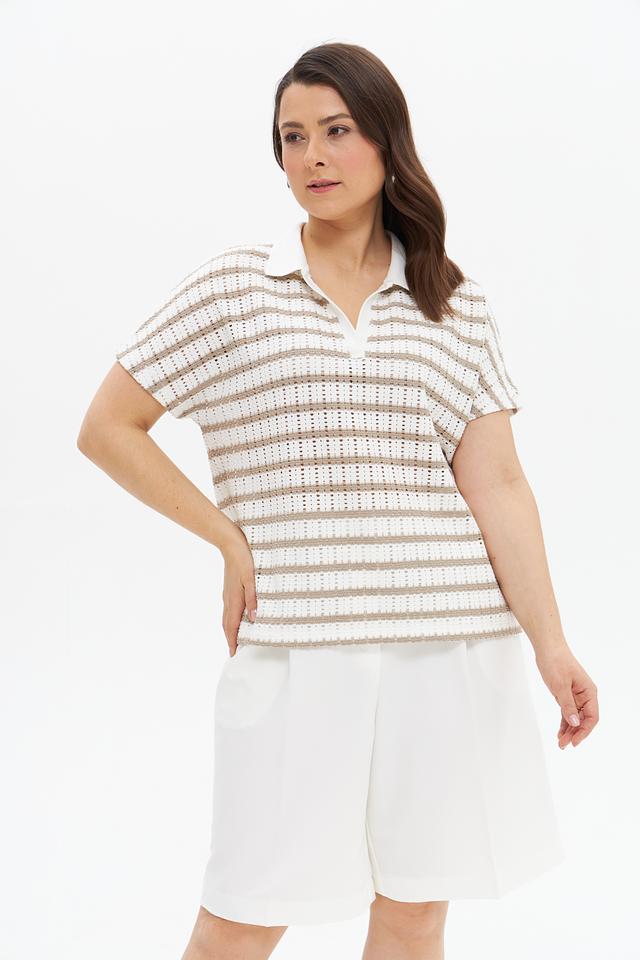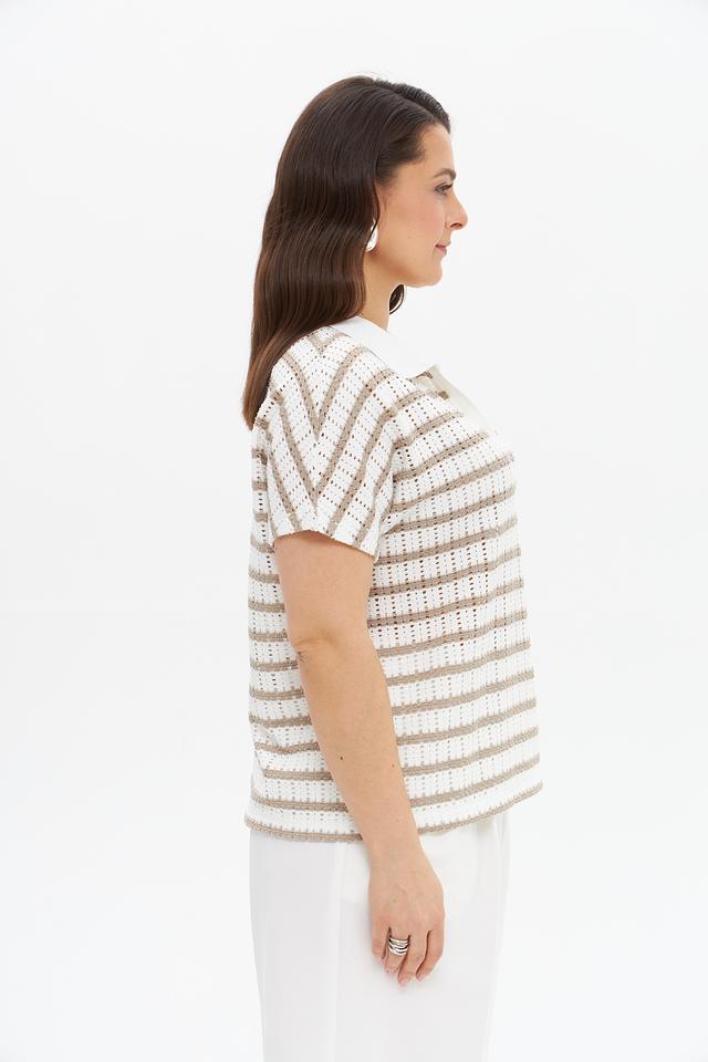 Бежевый пуловер от Tuzzi с коротким рукавом и воротником-поло в полоску. Модель выполнена из мягкого трикотажа с добавлением вискозы и эластана, обеспечивающего комфорт и свободу движений. Состав: полиэстер 61%, вискоза 34%, эластан 5%