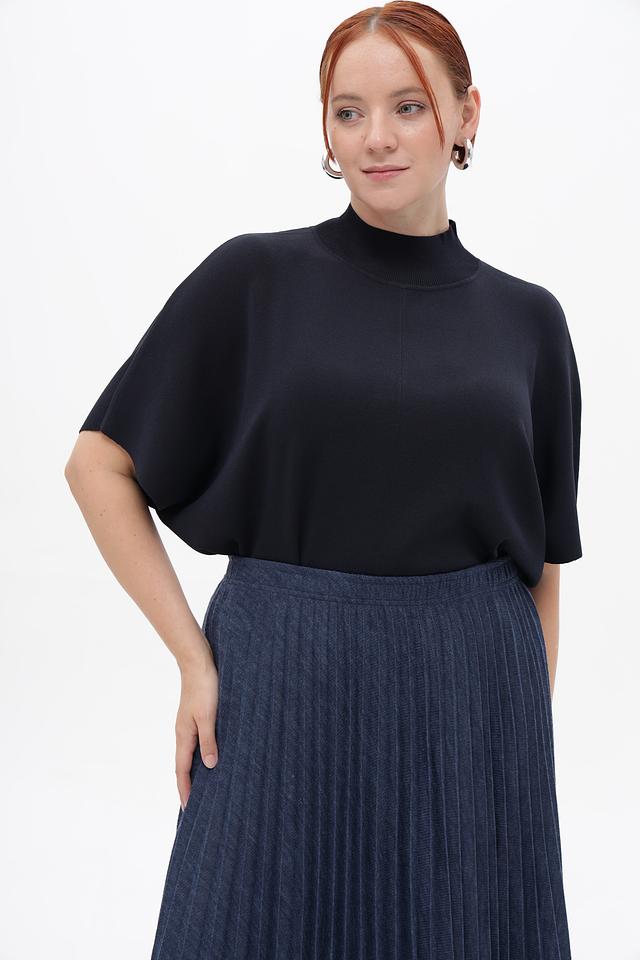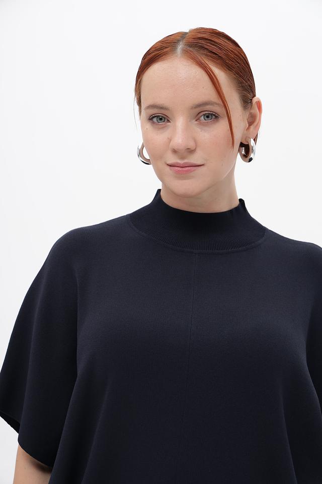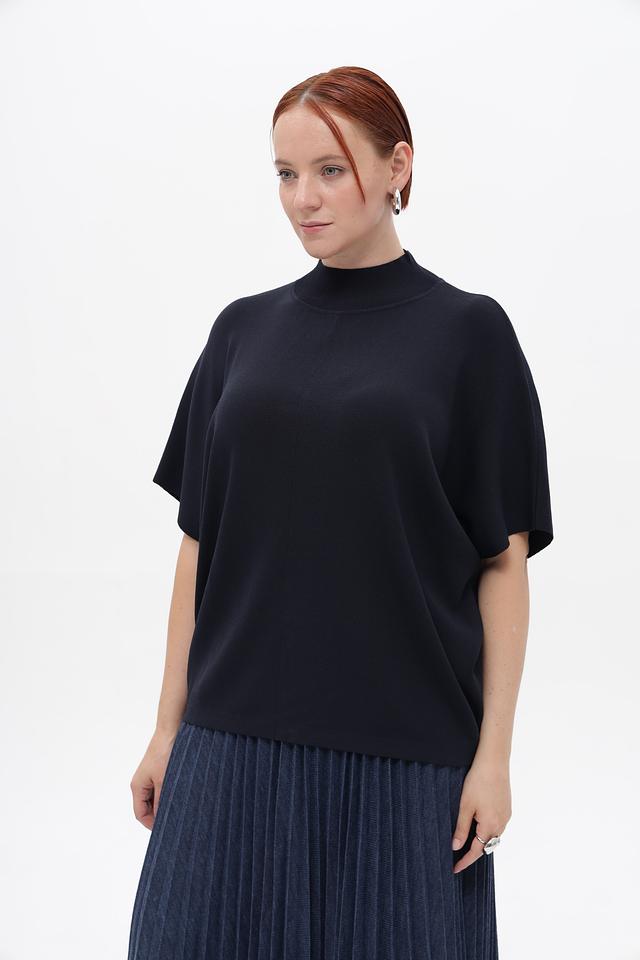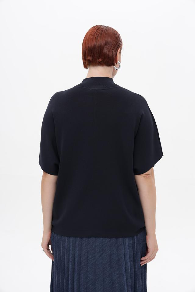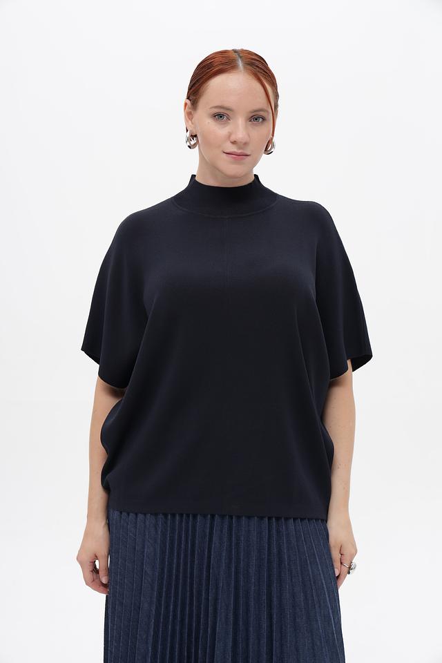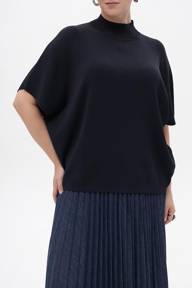 Пуловер имеет прямой крой и короткий рукав-крылышко, который придает ему особый шарм. Высокий воротник добавляет элегантности и позволяет создавать разнообразные образы.