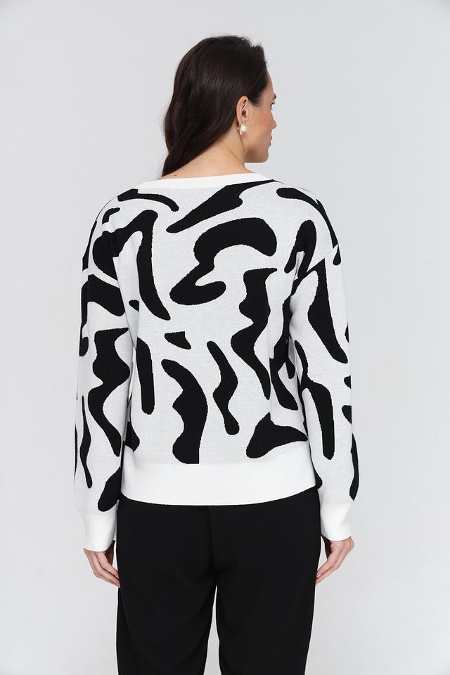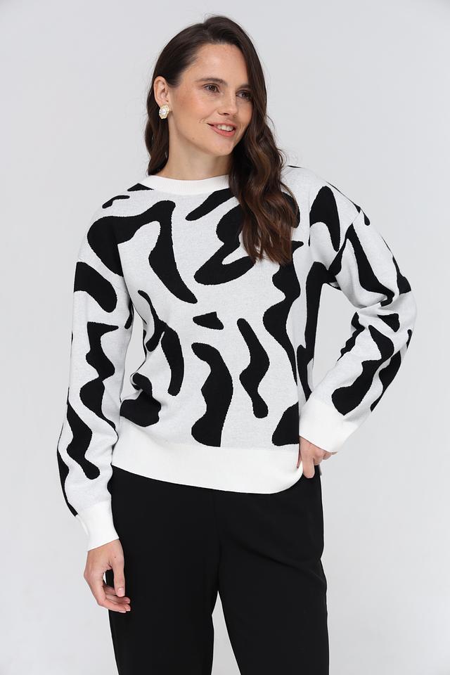 Женский пуловер UNQ белого цвета с оригинальным чёрным абстрактным рисунком. Изготовлен из мягкой и приятной к телу смеси полиэстера, акрила и шерсти. Стильный и комфортный выбор для повседневного гардероба. Состав: полиэстер 59%, полиакрил 15%, полиамид 10%, вискоза 10%, шерсть овечья 6%