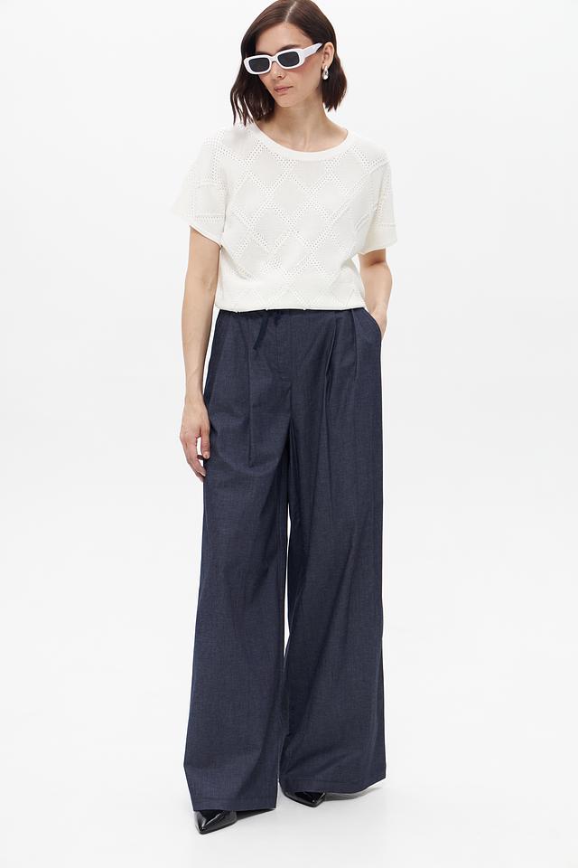Особенностью модели является ажурная вязка, которая придает ей лёгкость и изысканность. Короткие рукава делают пуловер идеальным для тёплой погоды.