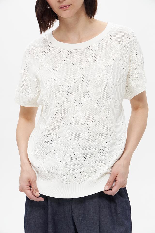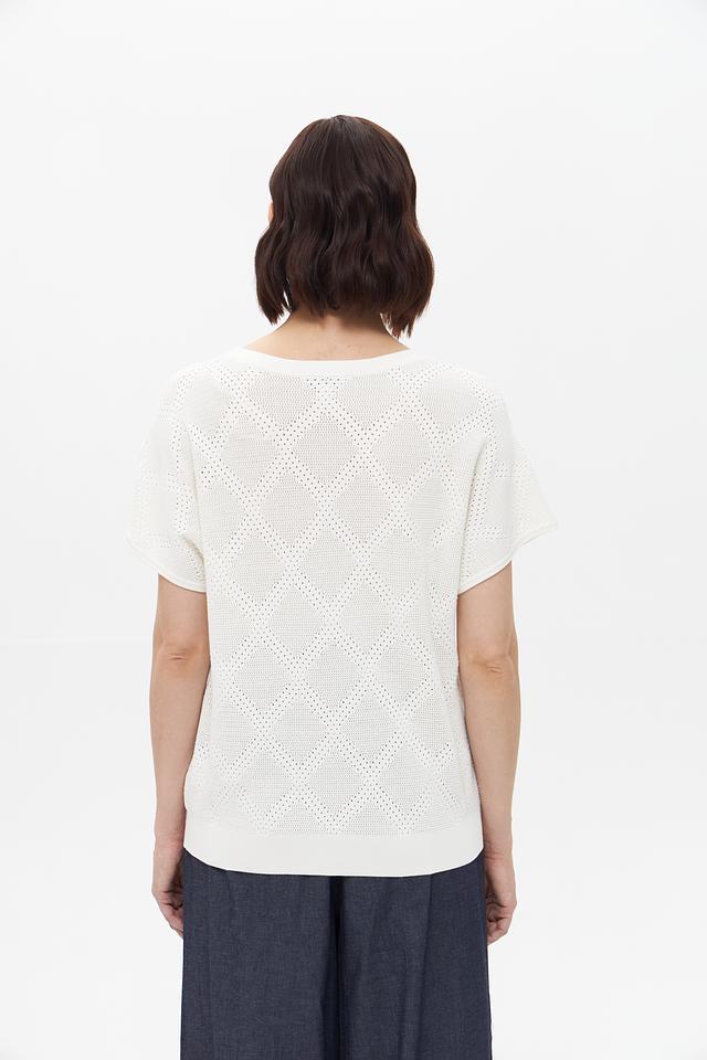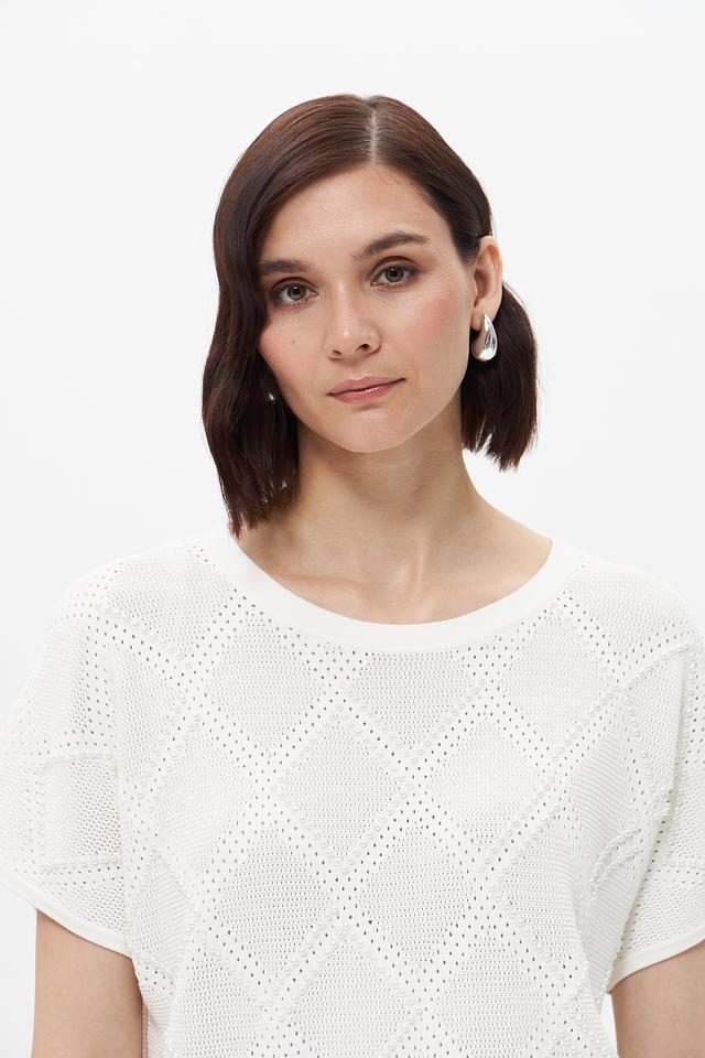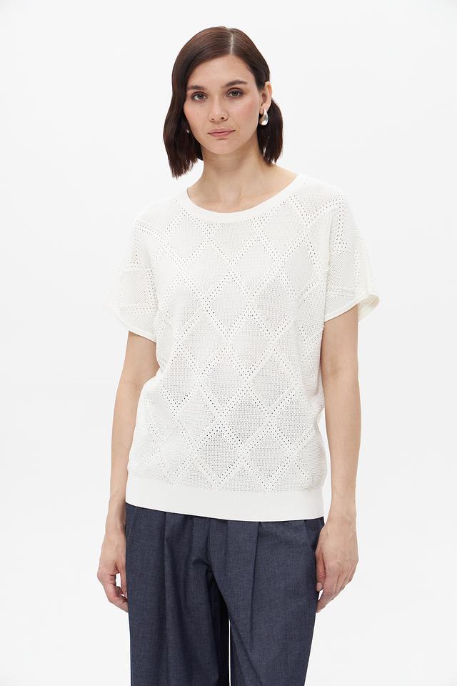 Белый пуловер от UNQ с короткими рукавами и ажурной вязкой. Изготовлен из 100% хлопка, обеспечивающего комфорт и воздухопроницаемость. Идеальный выбор для создания лёгкого и стильного образа. Состав: хлопок 100%