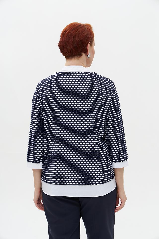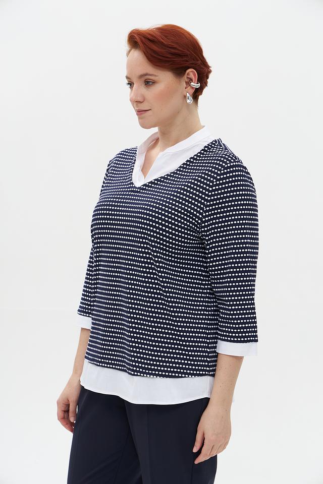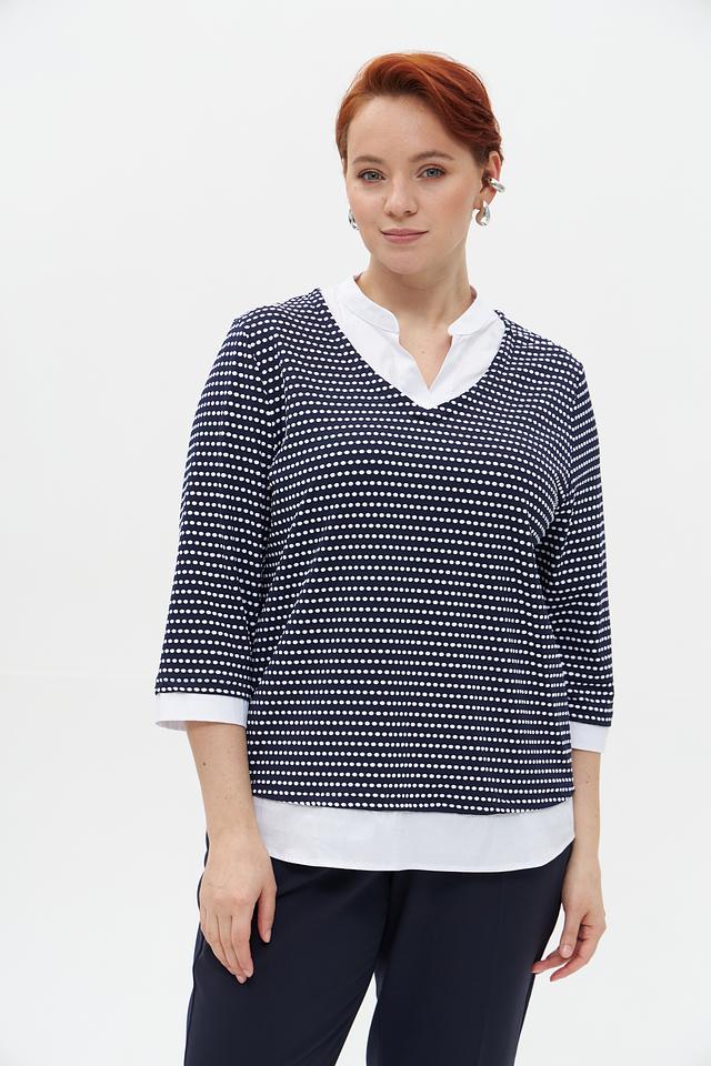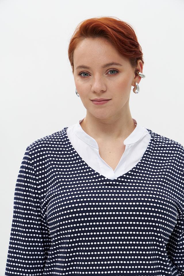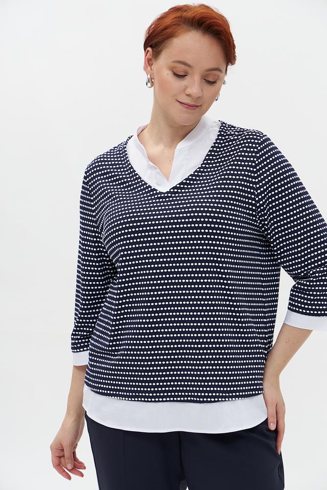 Женский пуловер Frank Walder темно-синего цвета с белым рисунком в полоску. Модель с V-образным вырезом и рукавом 3/4, выполненная из мягкого и приятного к телу трикотажа. Состав: полиамид 95%, эластан 5%