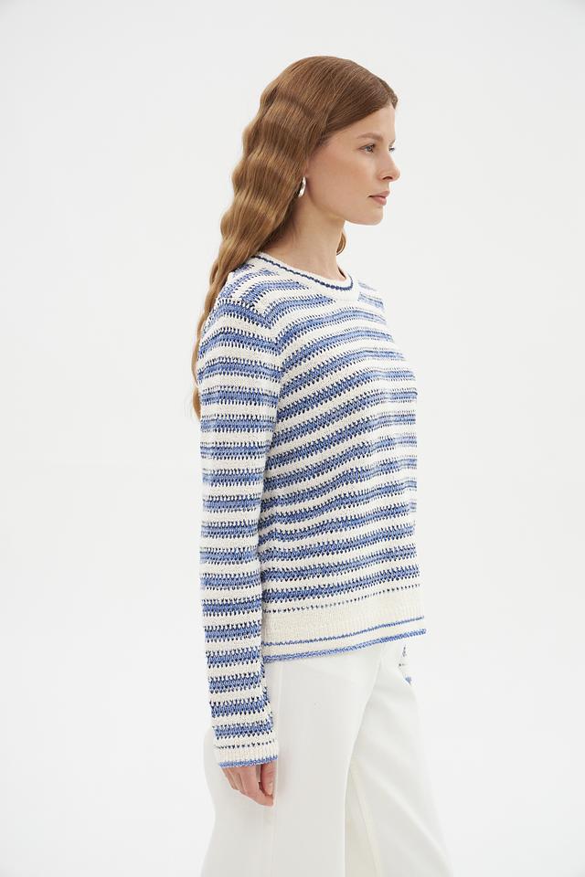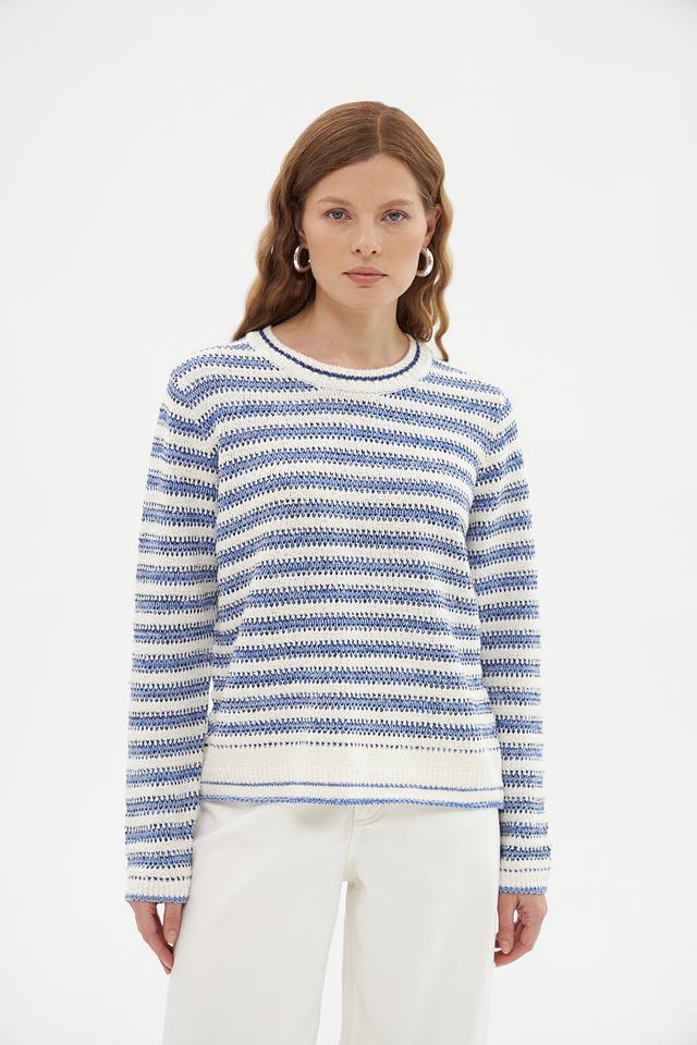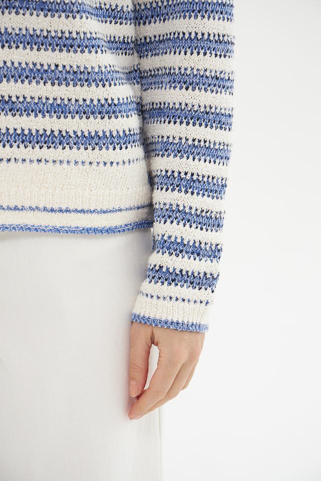 Этот стильный пуловер от Gerry Weber выполнен в классическом крое с круглым вырезом горловины и длинными рукавами. Основной цвет изделия – белый, дополненный синими полосами различной ширины, создающими яркий и динамичный образ.