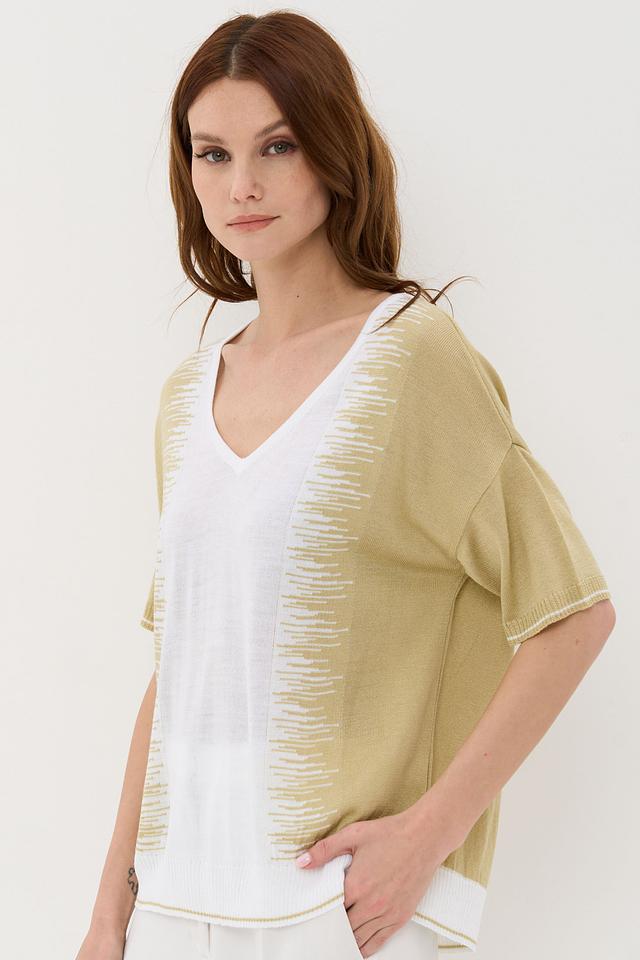 Пуловер имеет оливковый цвет и свободный крой, который не сковывает движения. Короткие рукава делают его идеальным для теплой погоды. Оригинальной деталью является бахрома, расположенная по переду изделия, что придает ему особый шарм и индивидуальность.