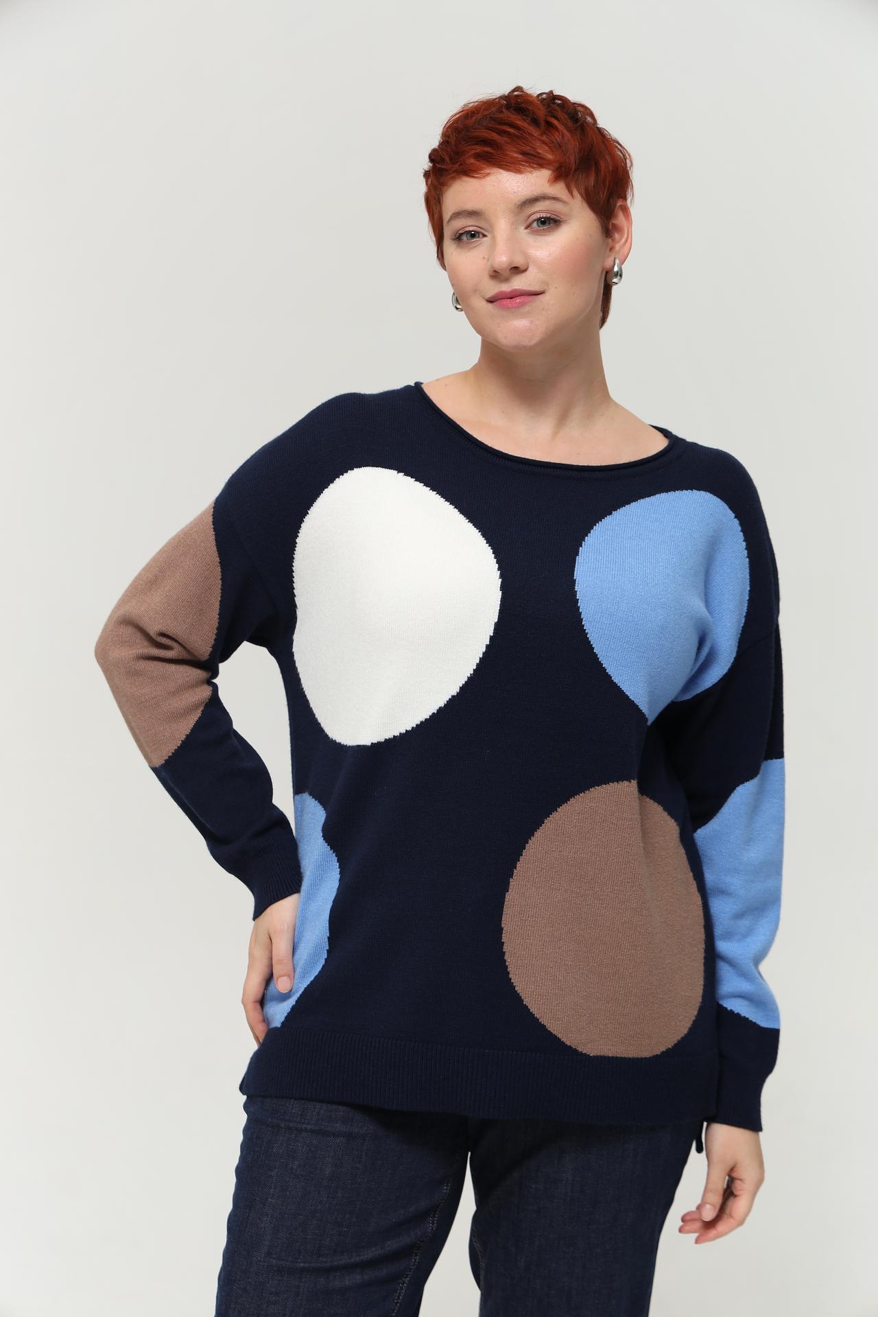 Оригинальный дизайн с крупным принтом в виде разноцветных кругов добавит яркости в ваш повседневный образ. Пуловер свободно сидит на фигуре, не сковывая движений. Идеально подходит для создания как повседневных, так и более нарядных образов.