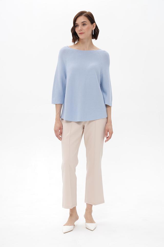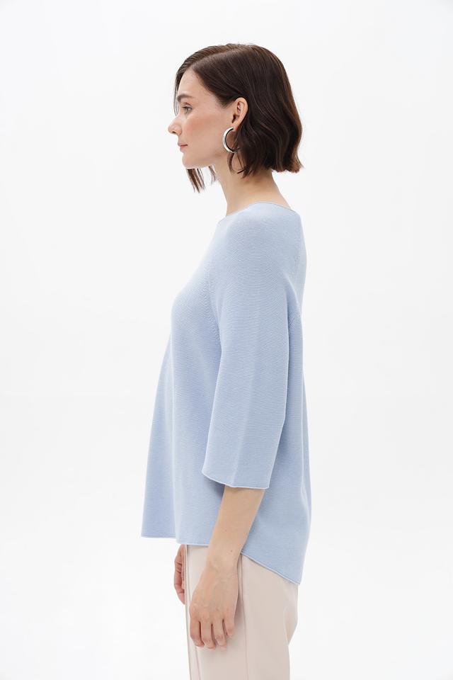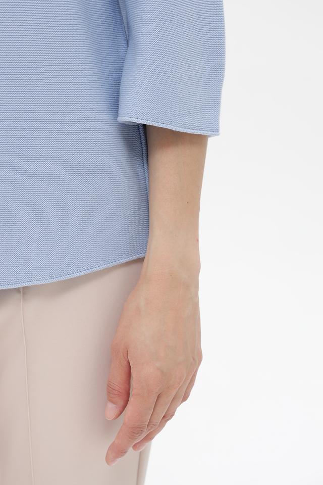 Модель имеет прямой силуэт, округлый вырез горловины и рукава длиной 3/4. Нежный голубой цвет пуловера легко сочетается с различными элементами одежды, позволяя создавать разнообразные образы. Текстура вязки придает изделию изысканность и элегантность.