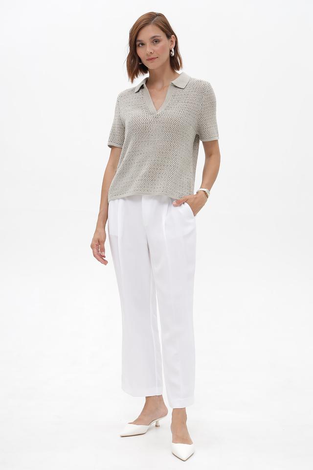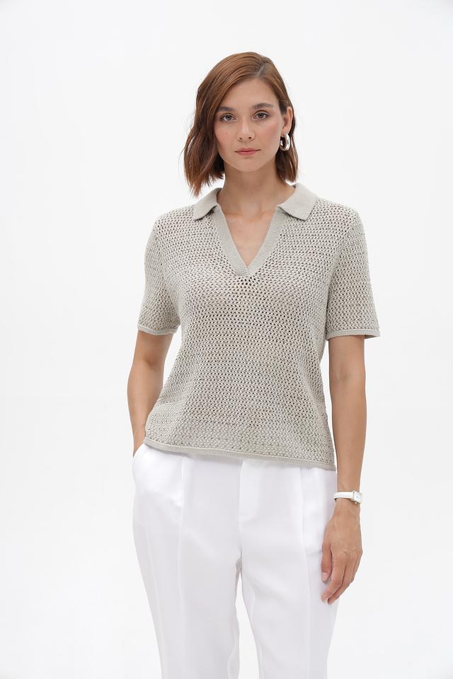 Модель имеет короткие рукава и классический воротник-поло, что придает ей элегантный и современный вид. Ажурная вязка добавляет легкости и оригинальности образу.
