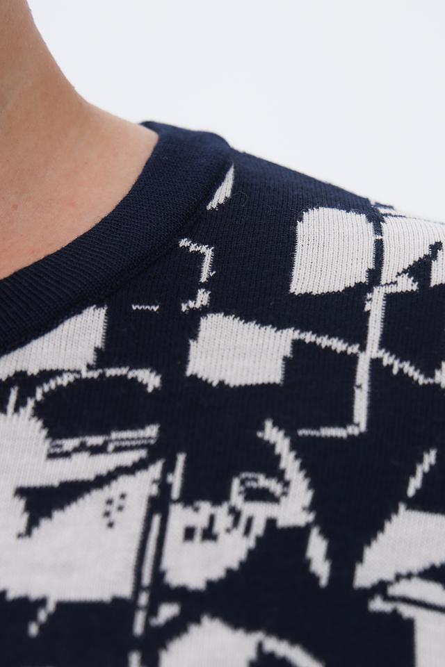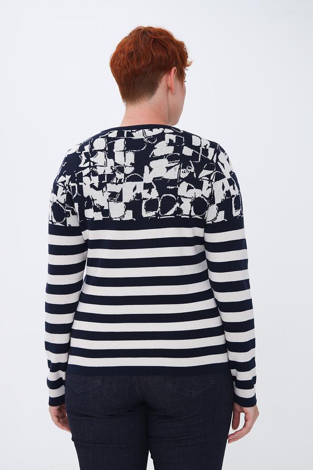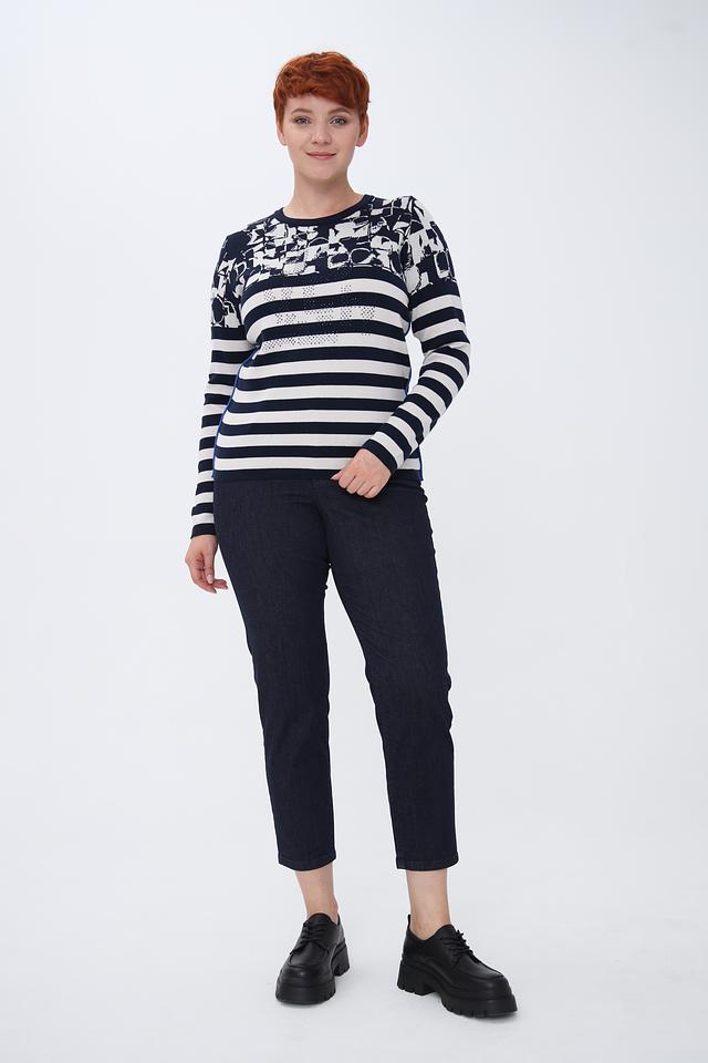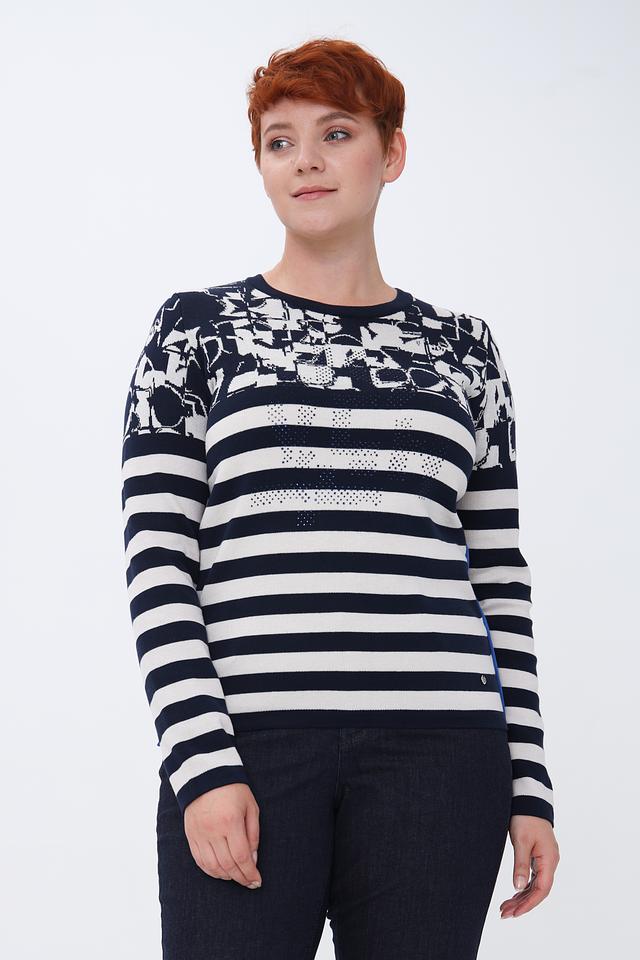 Этот стильный пуловер от Rabe collection станет отличным дополнением к вашему гардеробу. Пуловер выполнен в сочетании темно-синего и белого цветов в классическую полоску, а верхняя часть украшена ярким цветочным принтом.