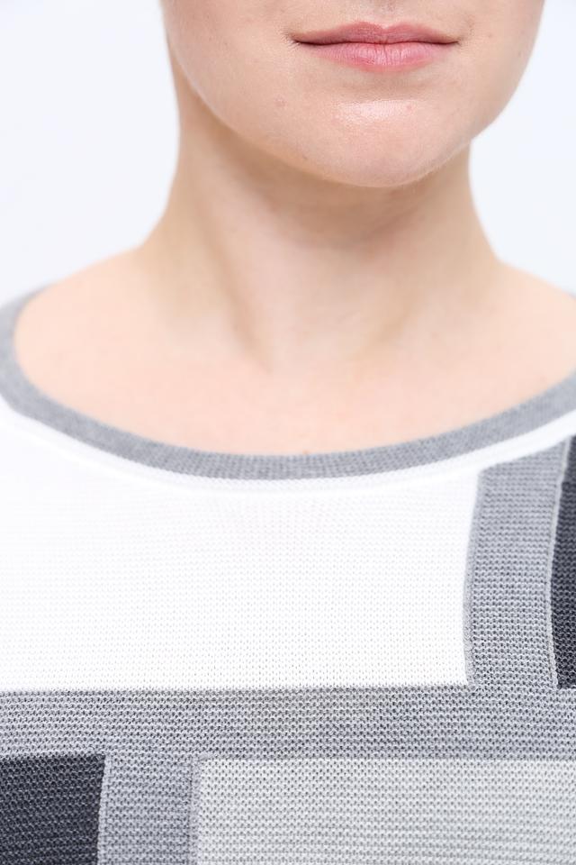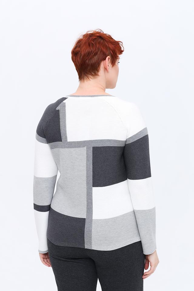 Дизайн пуловера выполнен в виде геометрического рисунка – крупной клетки, сочетающей в себе белый, серый и графитовый цвета. Такое сочетание делает его универсальным и легко сочетаемым с различными элементами гардероба.