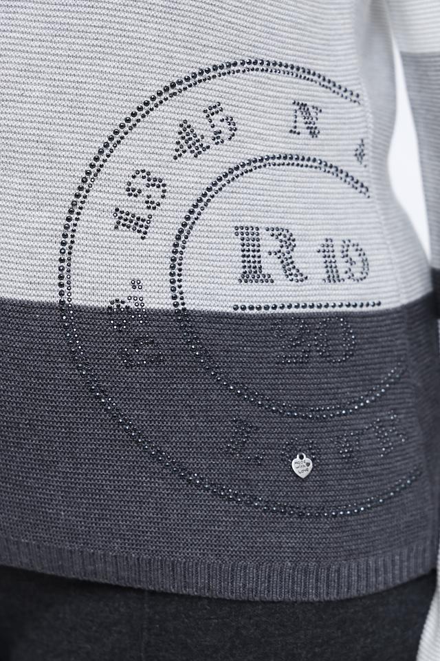 Пуловер имеет классический крой с длинными рукавами и округлым вырезом горловины. На передней части изделия расположен декоративный элемент с принтом, добавляющий оригинальности. Этот пуловер станет прекрасным выбором для повседневной носки, а также для создания более нарядных образов.