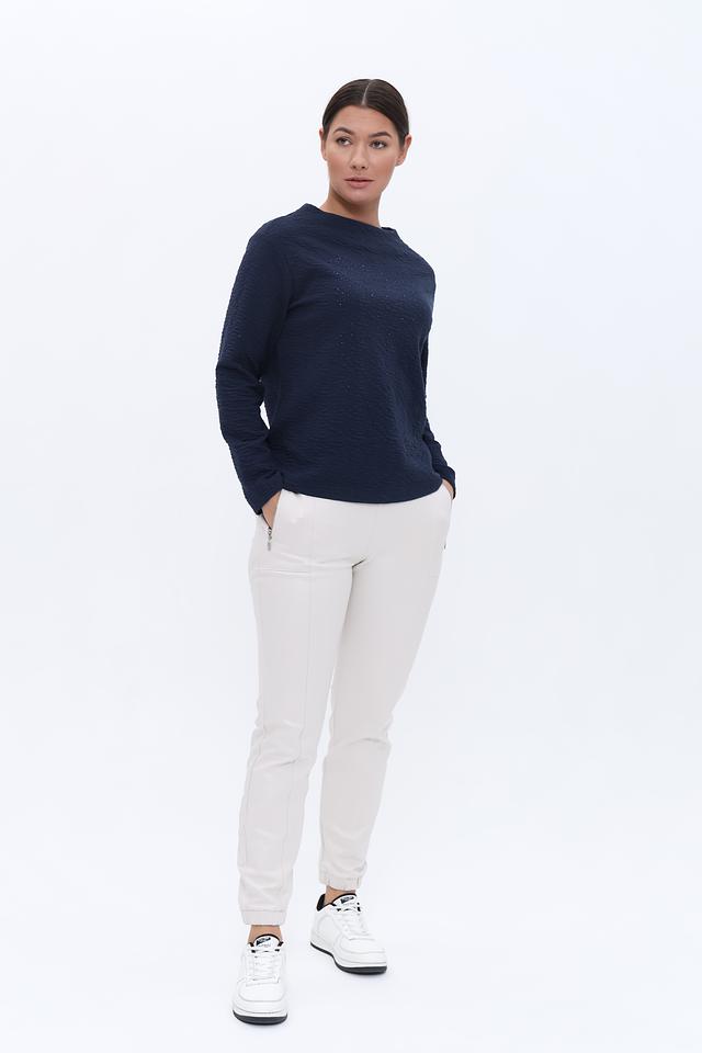 Особенностью модели является рельефная текстура вязки, создающая интересный визуальный эффект. Передняя часть пуловера украшена деликатной вышивкой из бисера, добавляющей изысканности образу. Состав ткани включает 60% хлопок, 37% полиэстер и 3% эластан, что обеспечивает комфорт, мягкость и хорошую посадку по фигуре.