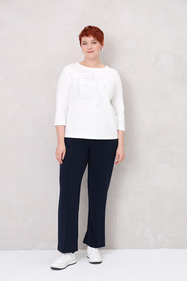 Модель имеет удобный крой и длину, подходящую для ношения с брюками, юбками или джинсами. Рукава 3/4 делают пуловер универсальным для любого времени года. Особый акцент в дизайне – декор из мерцающих страз, расположенный на передней части изделия.