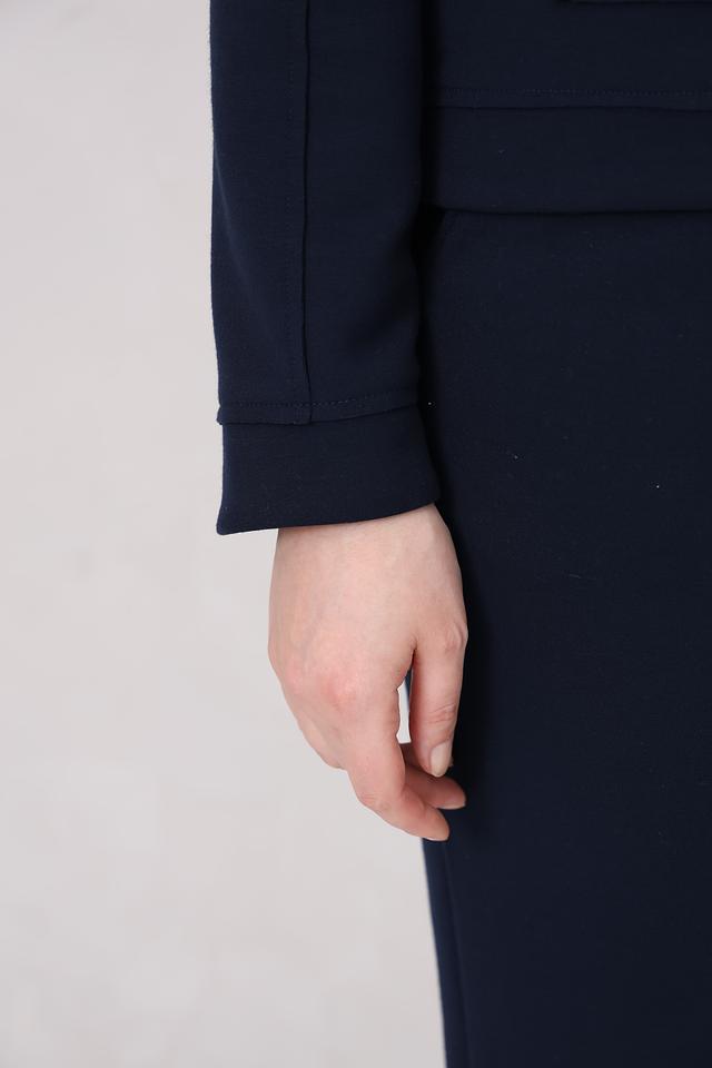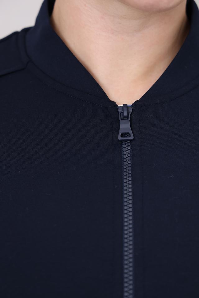 Жакет имеет удобную застежку на молнии, воротник-стойку и длинные рукава. Крой жакета слегка приталенный, что подчеркивает фигуру. Боковые карманы добавляют функциональности.