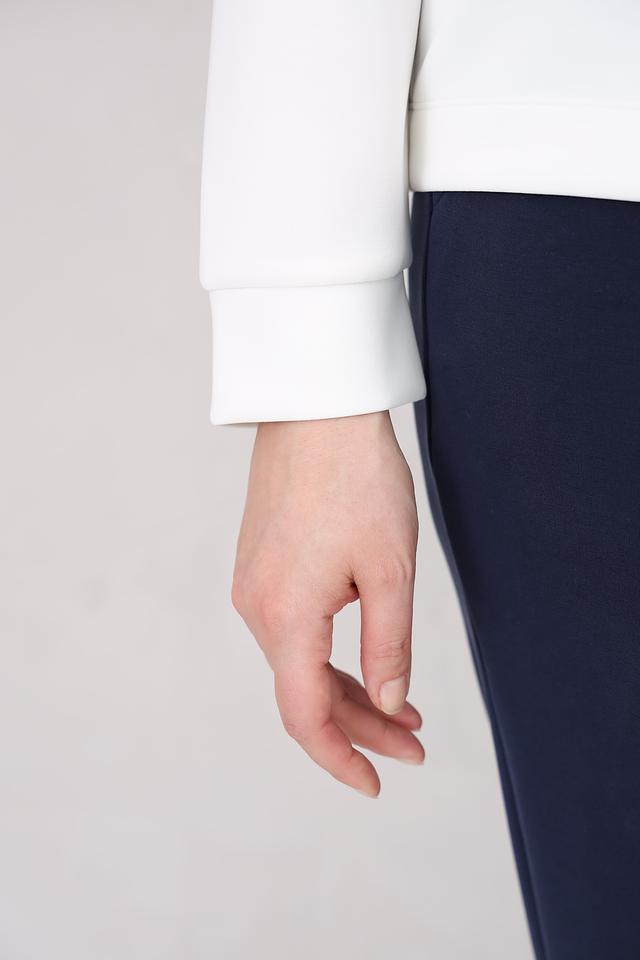 Состав ткани включает 48% модал, 47% полиэстер и 5% эластан. Модал придает пуловеру мягкость и приятные тактильные ощущения, полиэстер обеспечивает устойчивость к деформации, а эластан – хорошую посадку по фигуре и свободу движений.