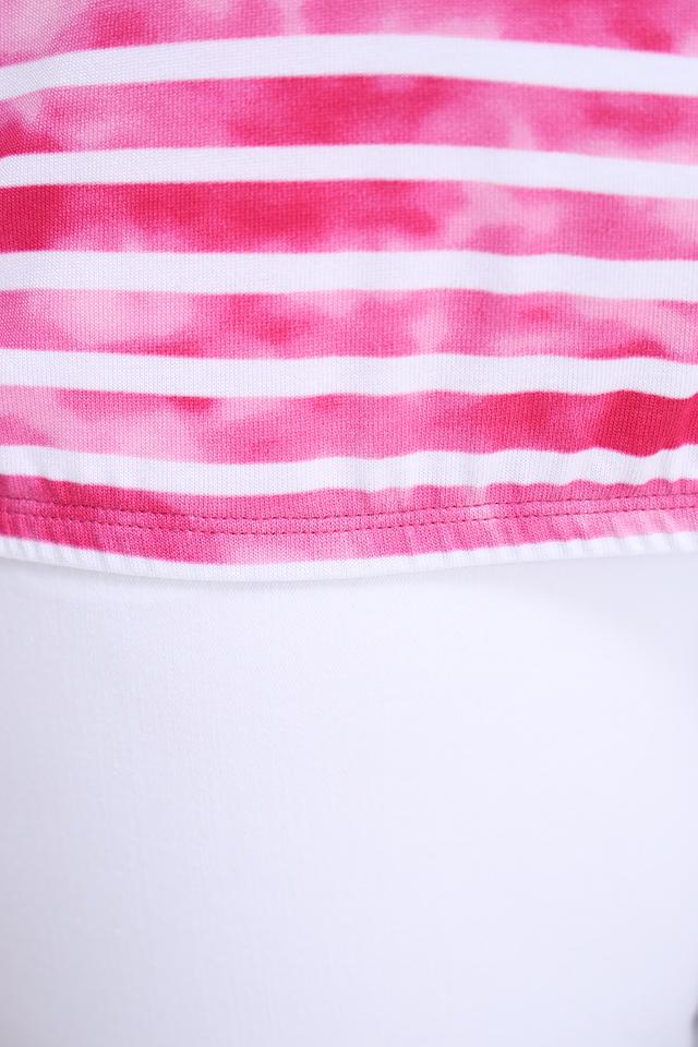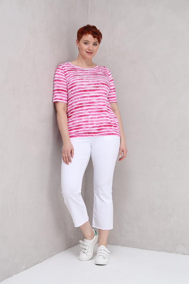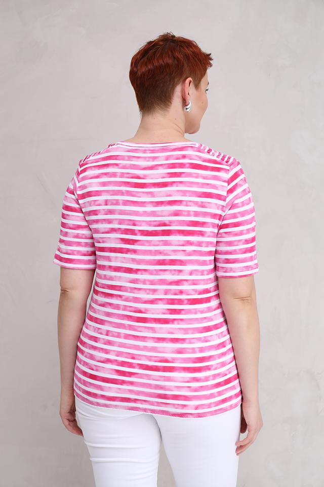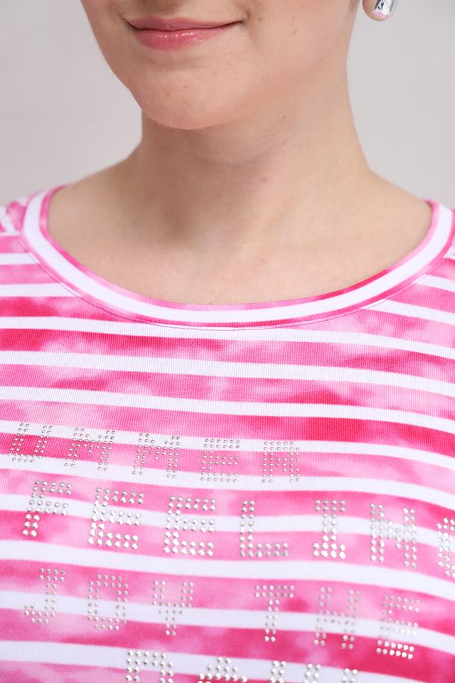 Эта футболка от Rabe collection – отличный выбор для создания повседневного образа. Футболка выполнена в яркой розовой гамме с классическим полосатым рисунком, который визуально освежает и придает легкость.