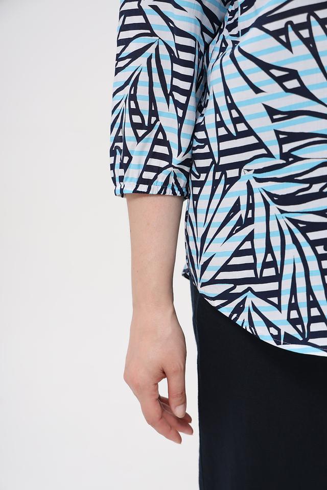 Блуза имеет оригинальный принт в виде стилизованных листьев, выполненный в сочетании голубого и черного цветов. V-образный вырез горловины и рукава длиной 3/4 придают модели элегантный и женственный вид.