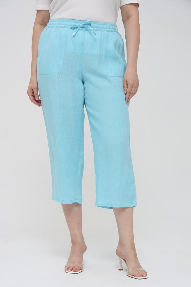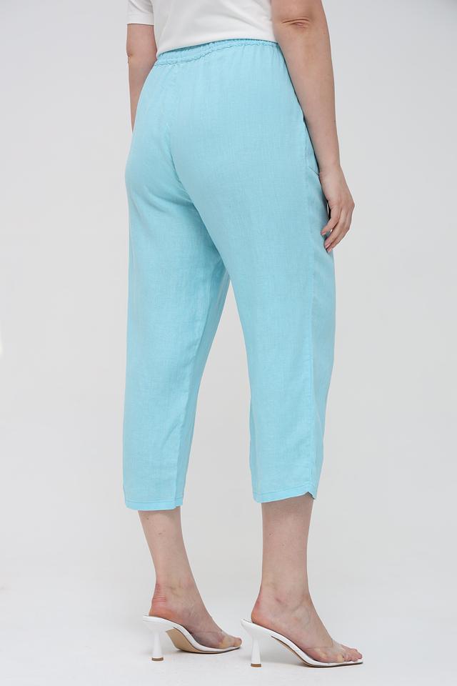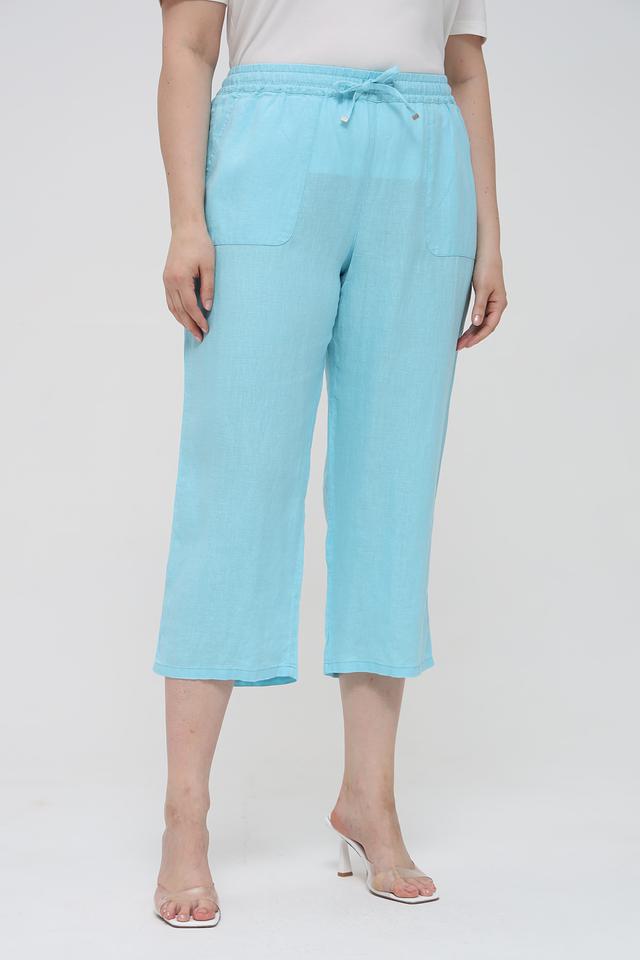 Женские брюки капри Rabe collection бирюзового цвета выполнены из натурального льна. Модель с заниженной талией и эластичным поясом на шнуровке, дополнена боковыми карманами. Состав: лен 100%