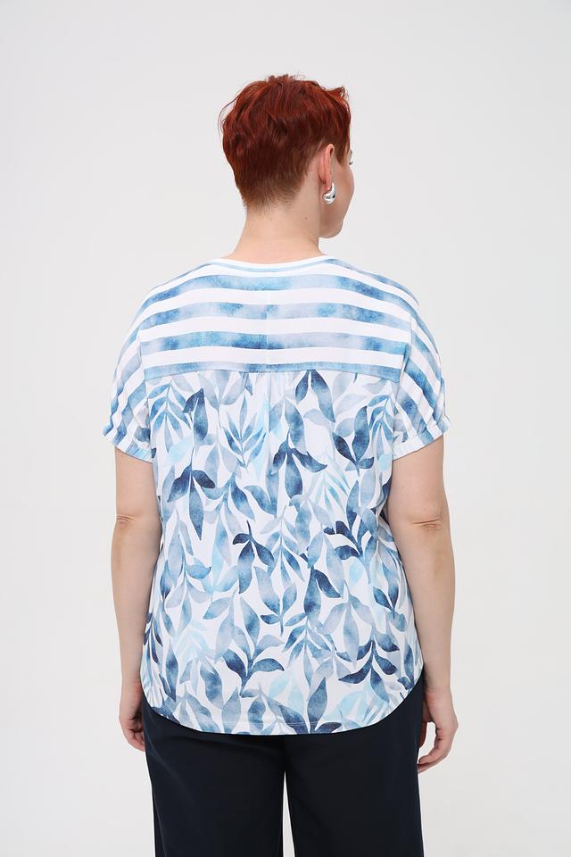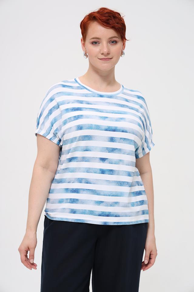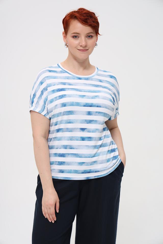 Женская футболка Rabe collection голубого цвета с ярким полосатым принтом. Изготовлена из мягкой вискозы с добавлением эластана для комфорта и свободы движений. Отличный выбор для создания повседневного образа. Состав: вискоза 96%, эластан 4%