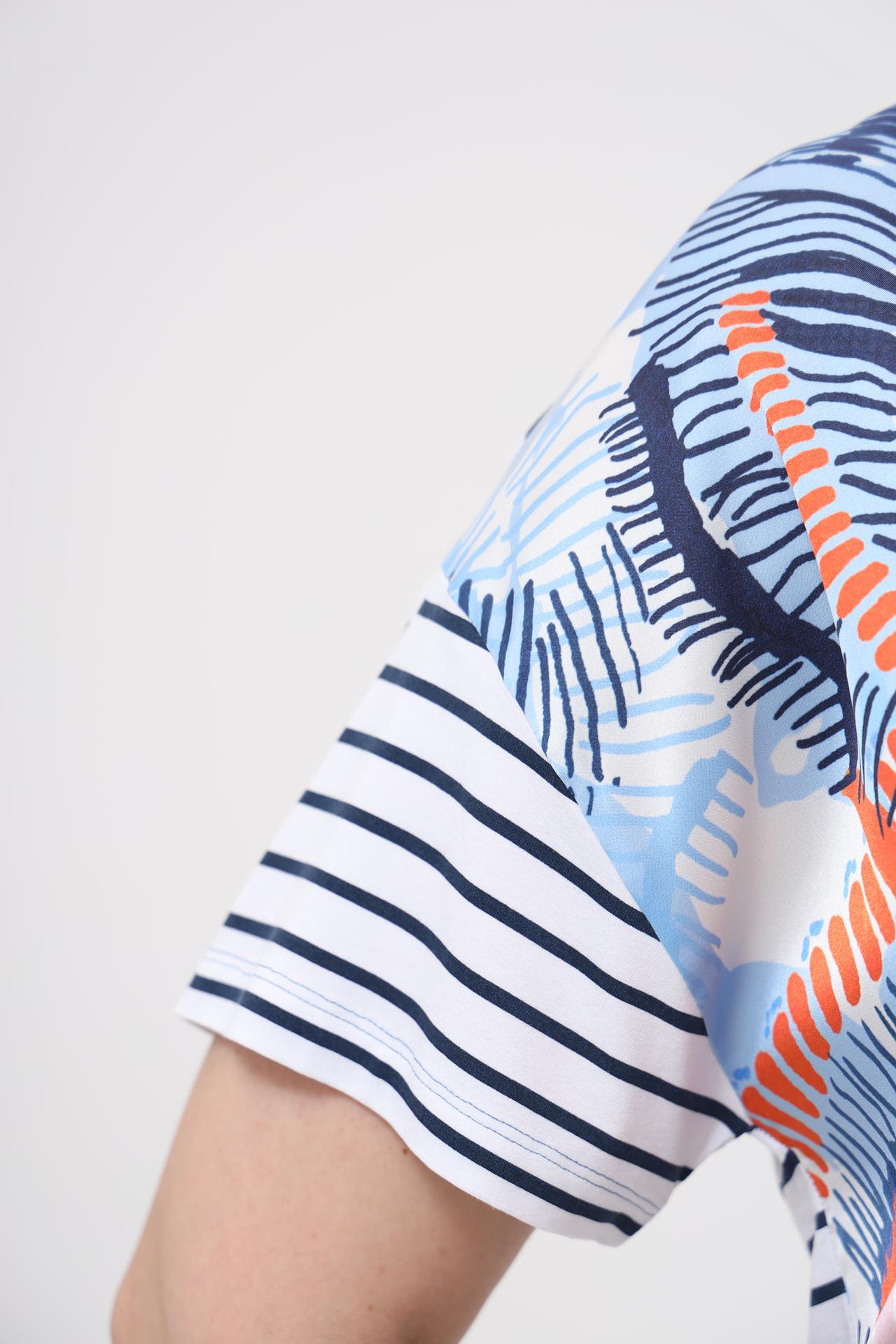 - Современный дизайн: Яркий абстрактный принт на передней части гармонично сочетается с классическими полосками на спинке и рукавах, создавая стильный и запоминающийся образ.