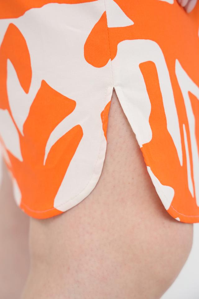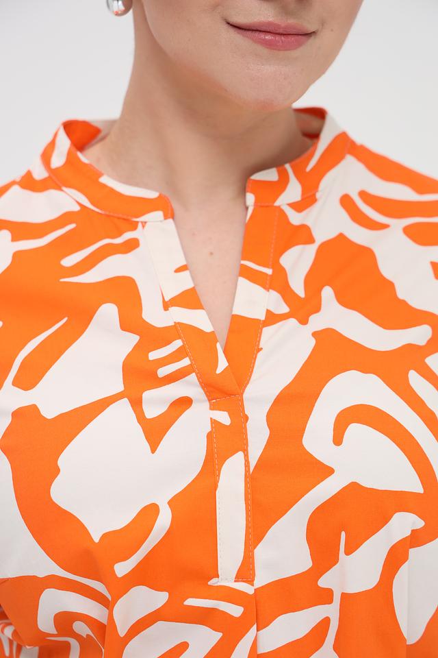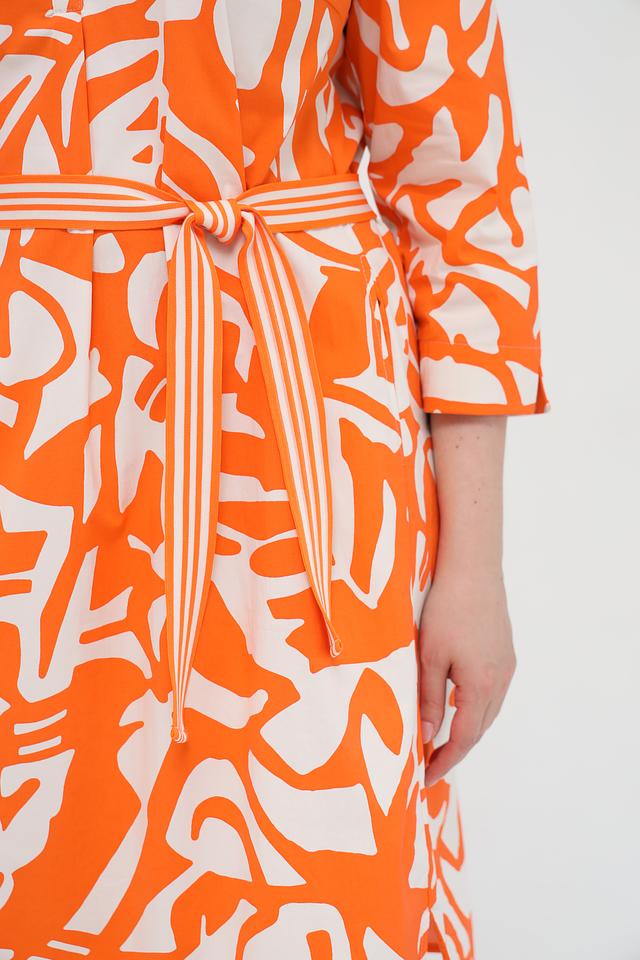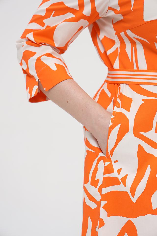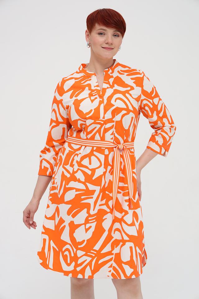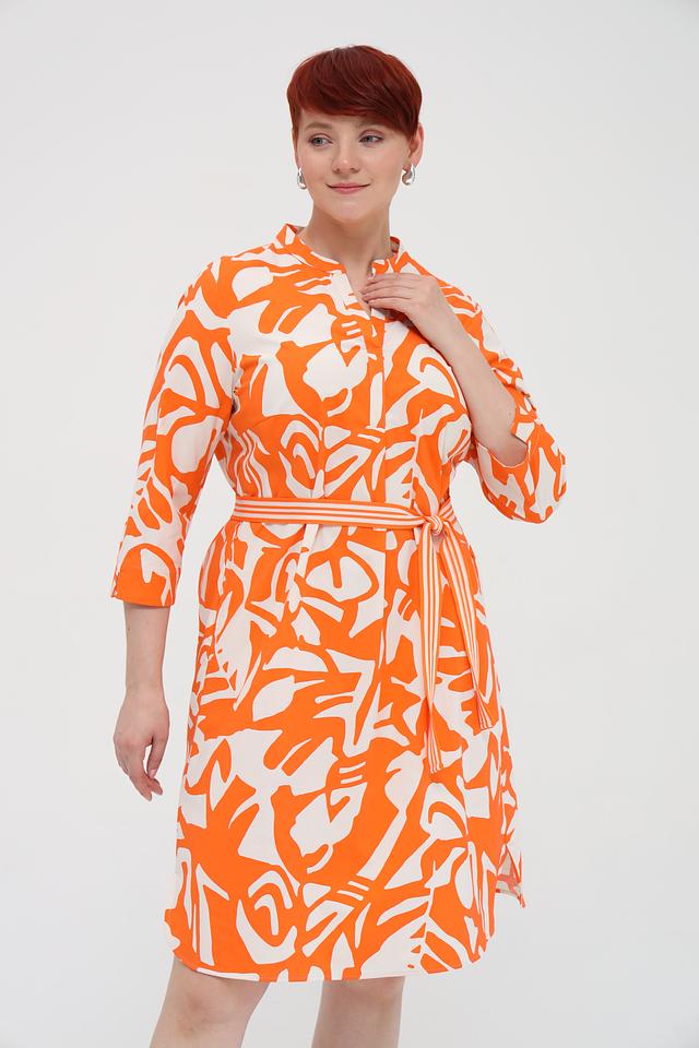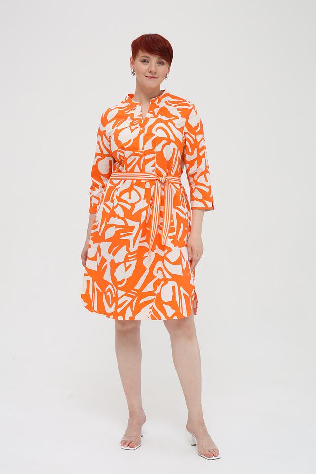 Платье имеет яркий оранжевый цвет с абстрактным белым принтом, который придает ему оригинальность и неповторимость. Модель с рукавами три четверти и V-образным вырезом. Талия подчеркнута приталенным силуэтом и съёмным поясом.